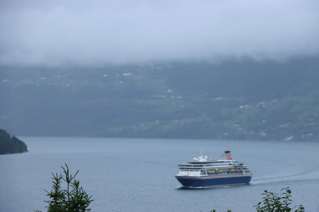 Er liggen geen cruiseschepen bij Geiranger, een eerder zeldzaam fenomeen geloof ik. De Hurtigruten had er wel juist een lading gedropt en was op de weg terug. Er was vanmorgen wel een schip onderweg richting Stryn, waarschijnlijk doen ze van daar een uitstap richting Jostedalgletjers.
