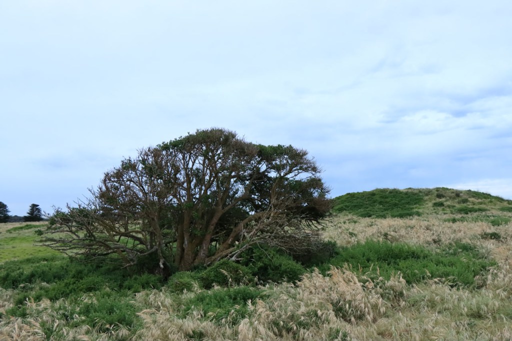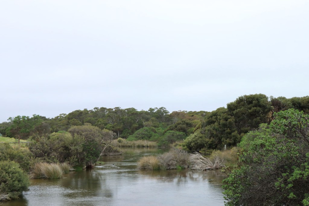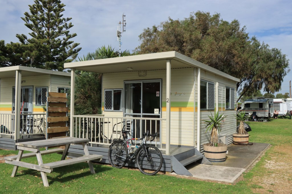 Het was vandaag best mooi weer maar de wind blijft me tarten. Voorbij Robe, waar ik mijn lunchbreak nam, ging het beter. Ik leek de wind er eerder in het voordeel te hebben en ook het asfalt liep er wat beter. Tot aan het slot, de laatste 6 Km, toen ik terug richting zee moest. Daar kreeg ik de wind weer op de neus en zag ik ook van over zee een grijze hemel naderen. Die grijze hemel naderde snel en de laatste 1,5 Km kreeg ik nog regen, ik deed er mijn regenjas niet meer voor aan maar werd op dat stukje toch nog behoorlijk nat. De plotse regen op een mooie was ook gespreksonderwerp in de receptie en later ook, onder de locals, in de supermarkt.