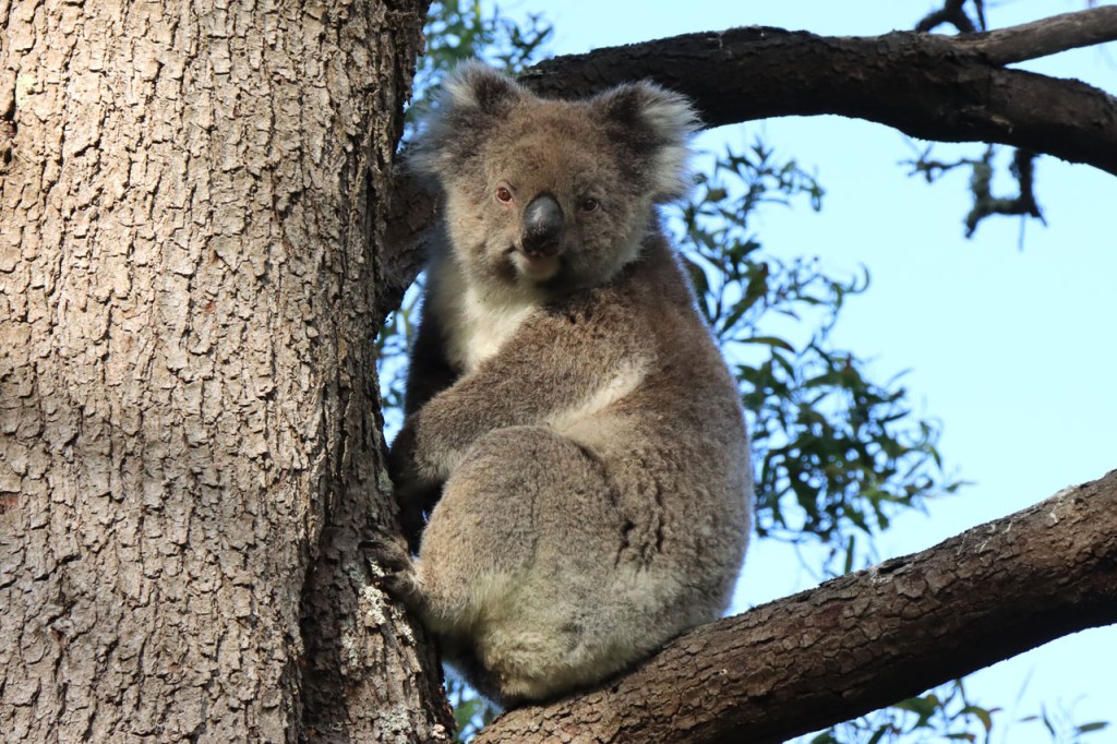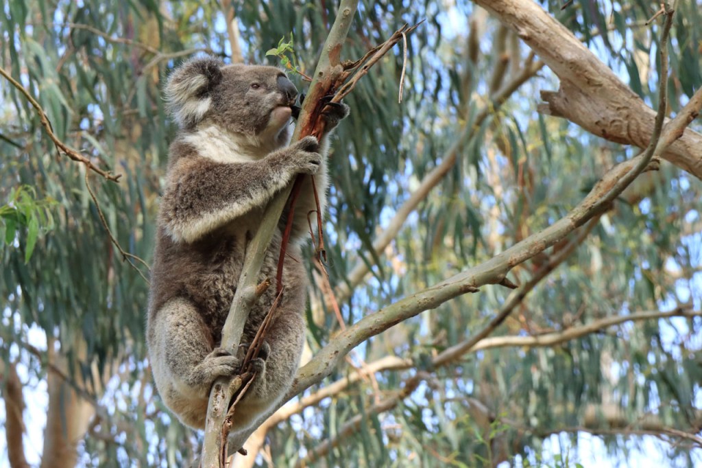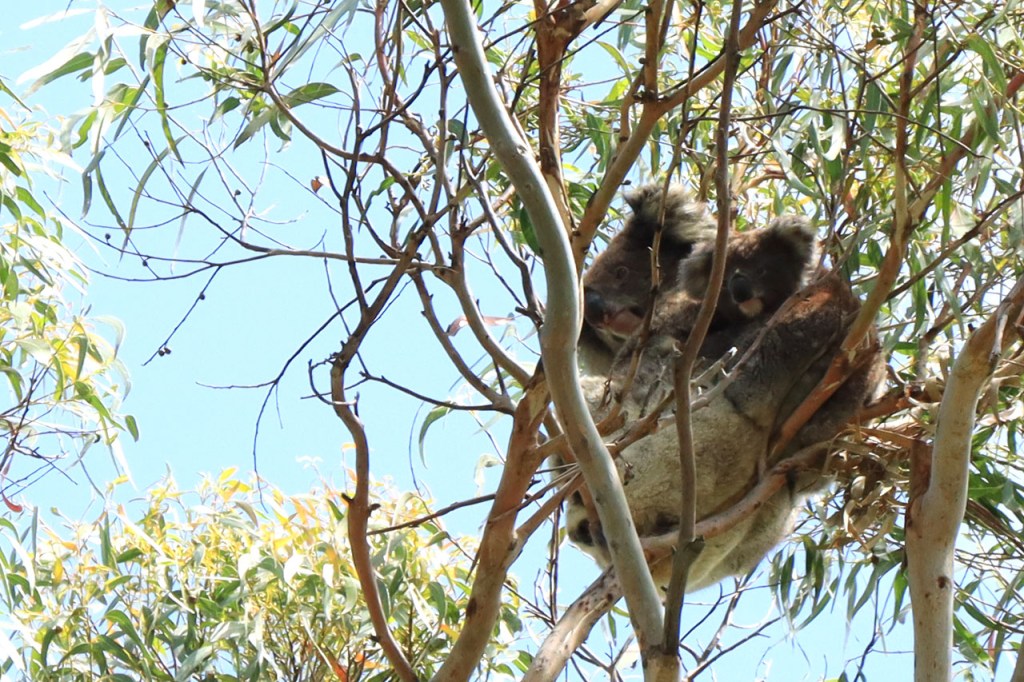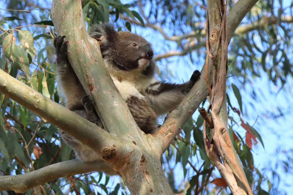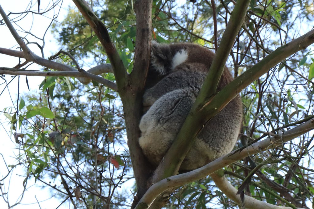 Ondanks de lange lastige weg kon ik toch mijn geluk niet op vandaag. Wanneer je naar Australië komt dan reken je erop om kangoeroes te zien, ze zijn wel eerder nocturnel maar ze zijn zowat overal en behoorlijk goed zichtbaar. Bovendien zullen ze wel wat drukker zijn bij avondschemering en ochtendgloren maar zijn, zoals de reeën bij ons, toch ook gewoon overdag actief. Koala’s zijn een andere zaak. Ook die hoop je stilletjes wel te zien maar die zitten overdag wel rustig hoog in hun boom en de kans om ze daar te spotten is echt wel klein en net dat is me vandaag dus wel gelukt 🙂 .