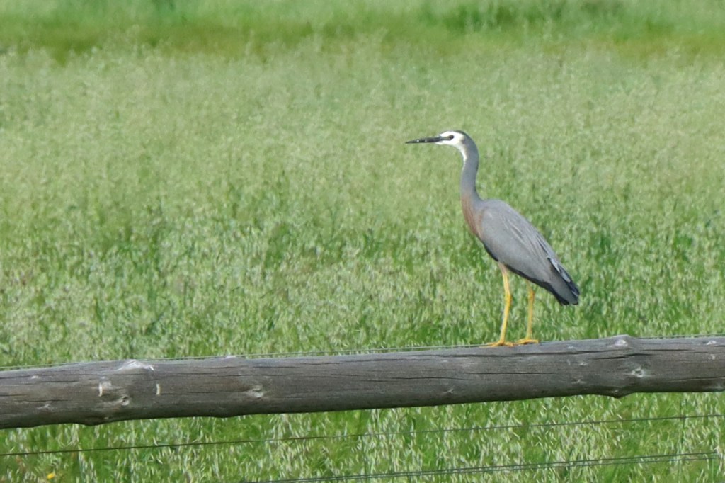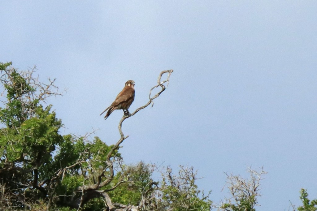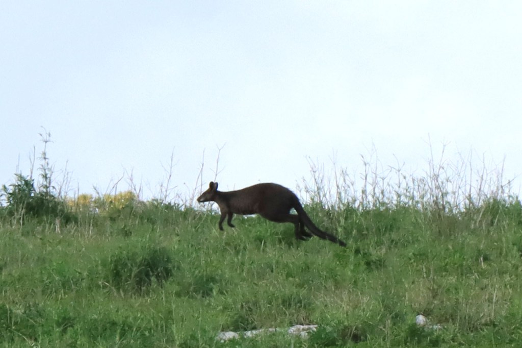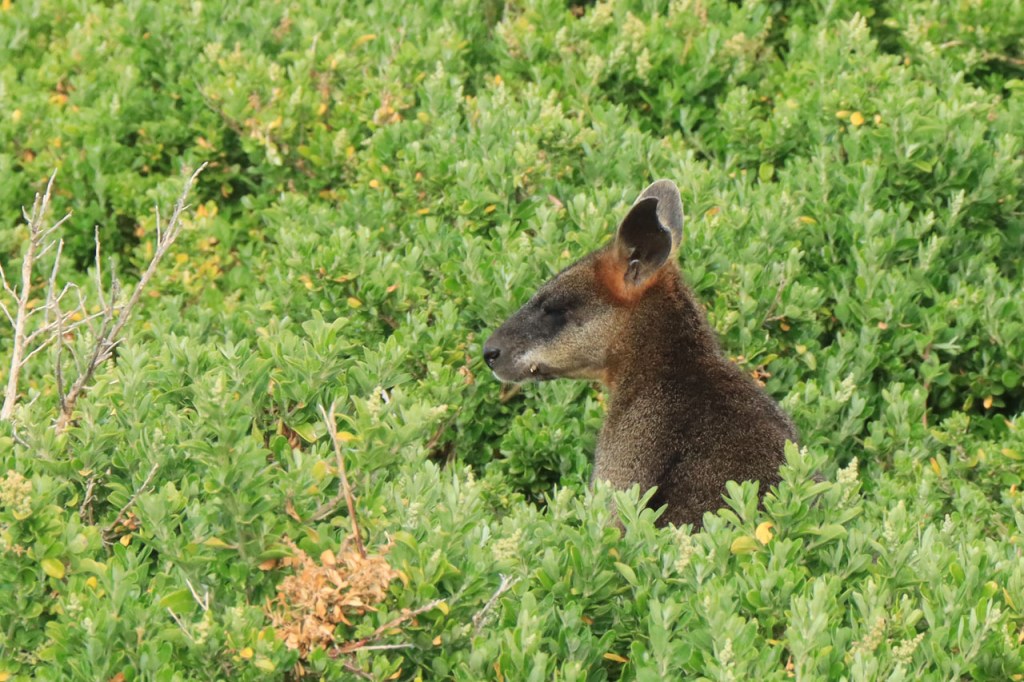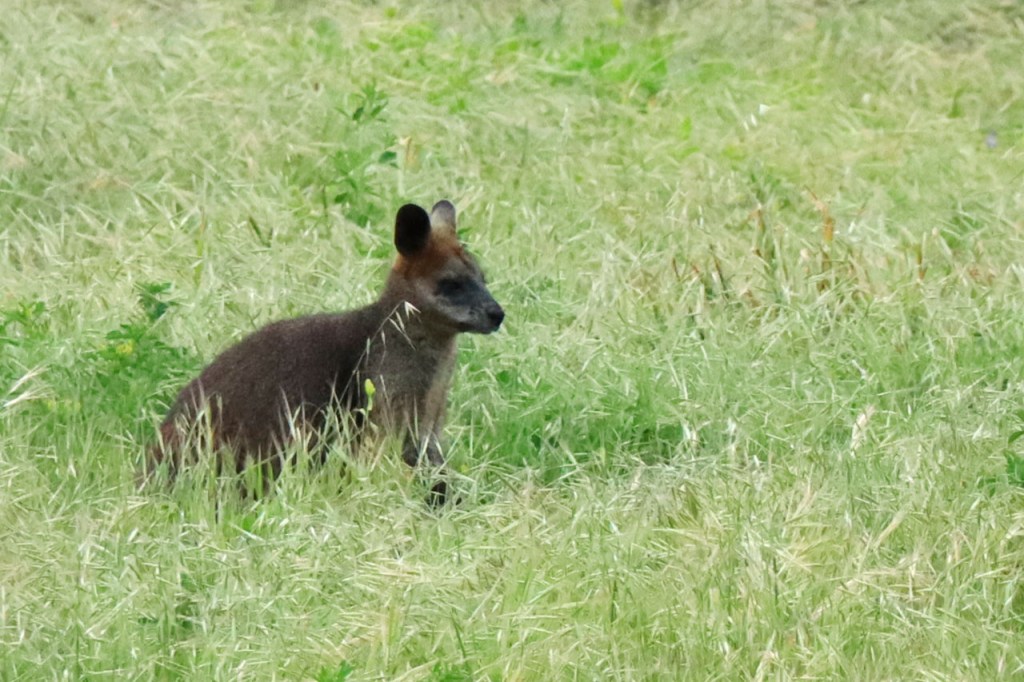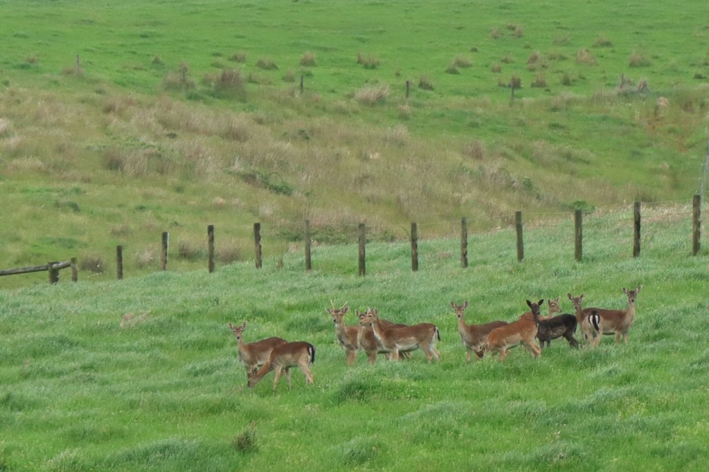 De Settlers introduceerden blijkbaar ook herten. Ik had al een paar verkeersslachtoffers gezien maar nu dus ook een groep levende. Er staat een omheining in de achtergrond maar ik had niet het idee dat ze in gevangenschap zaten.
