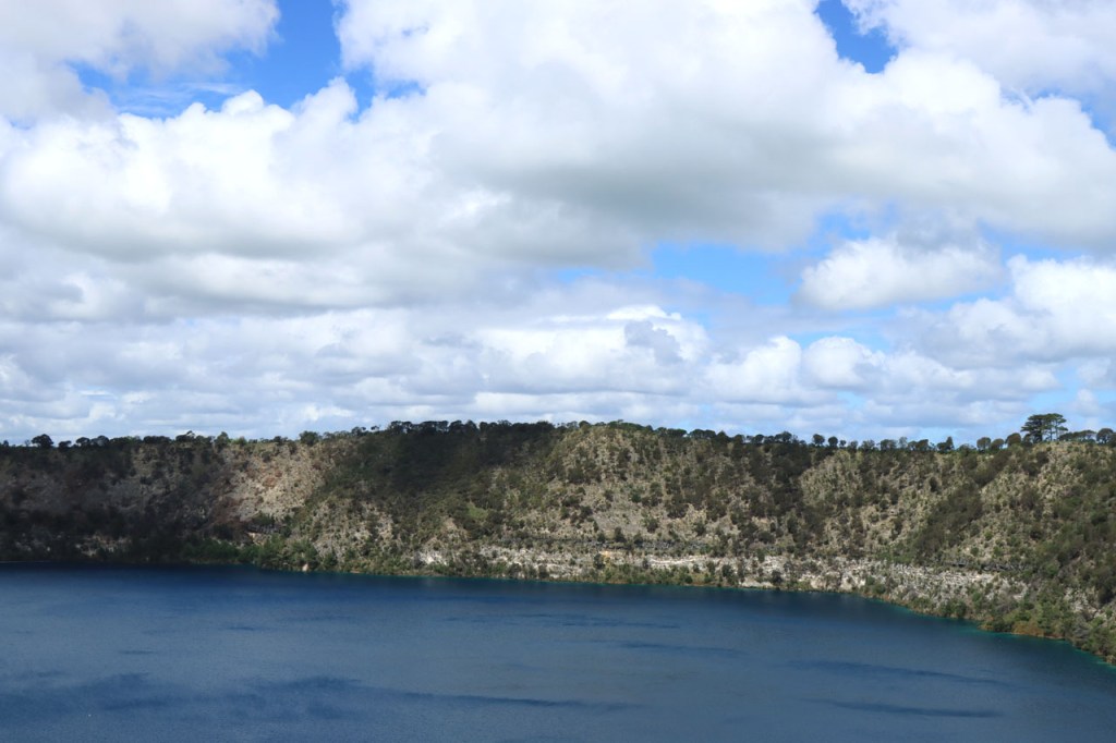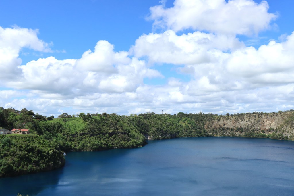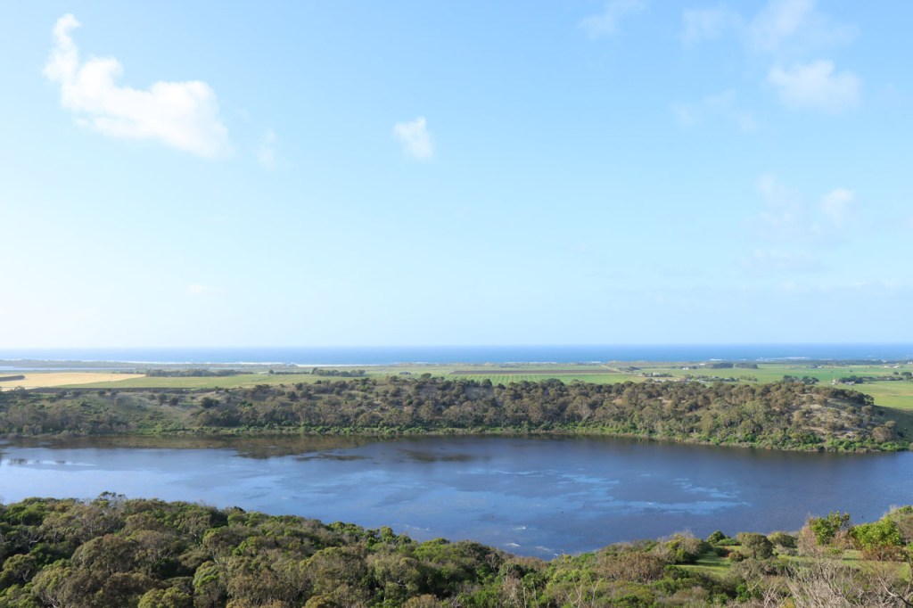 Ik verblijf vandaag in het “Blue Lake Holiday Park”. Het nabijgelegen Blue Lake is 1 van de origineel 4 kratermeren in de omgeving van Mount Gambier. Het zou zo’n 70 meter diep zijn en gevoed worden door het grondwater. Het voorziet al sinds zowat 1860 het stadje van drinkwater en dat gebeurt sinds 1930 via het nabije pompstation. 2 van de 4 meren zijn sinds de jaren 1980 opgedroogd door het zakkende grondwaterpeil.
