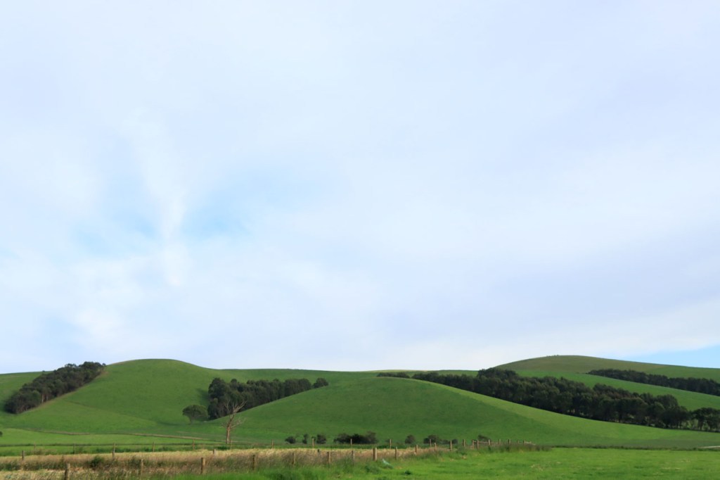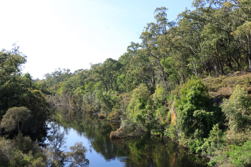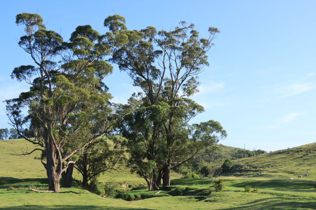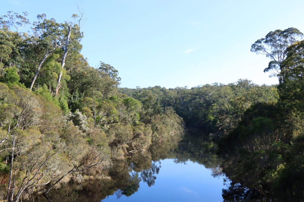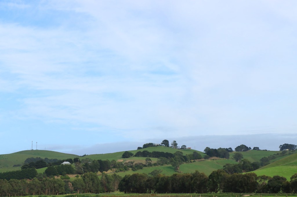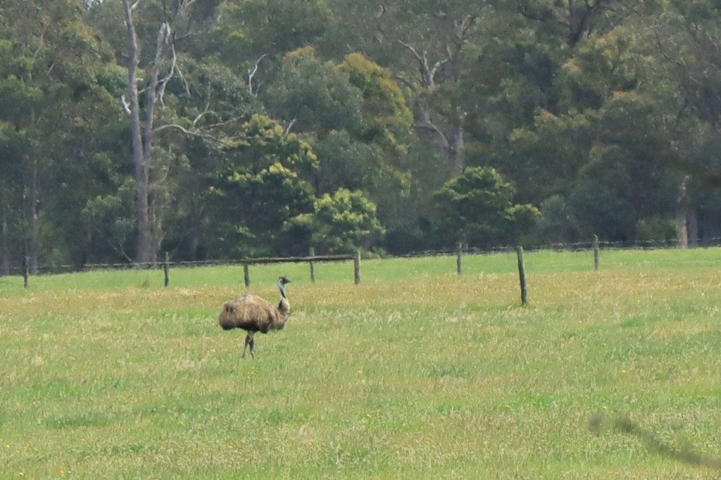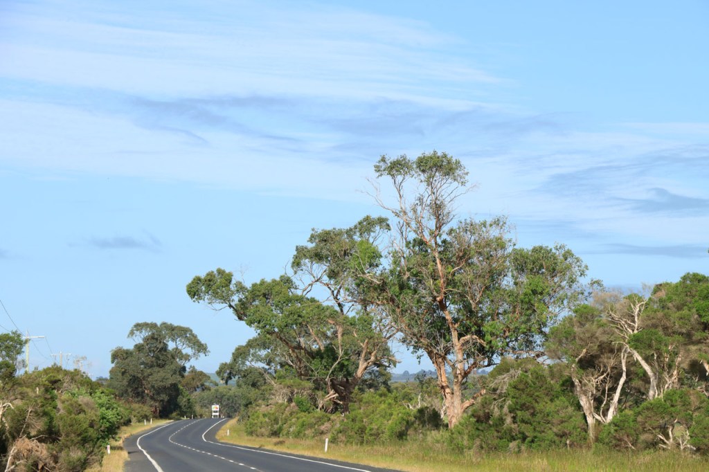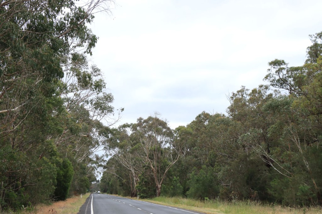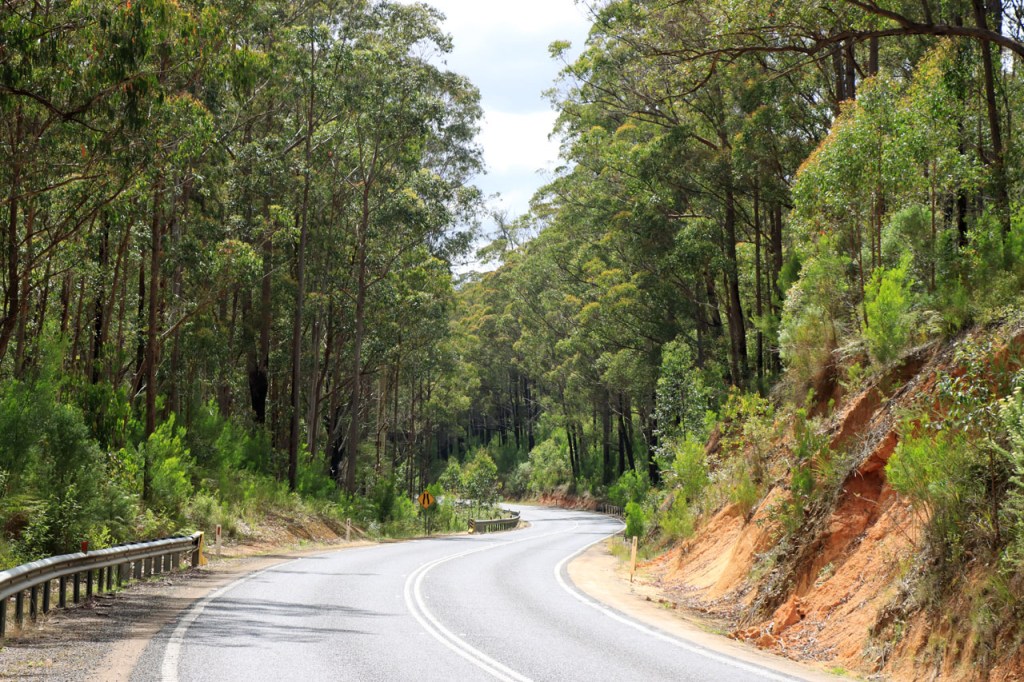 Ik ga vandaag nog eens beginnen met een stukje over gisteren, over het Australisch accent. Over het algemeen kom ik wel behoorlijk goed weg maar af en toe loop ik toch vast. Gisteren vroeg ik aan de gastvrouw, die net op de gang passeerde met een paar nieuwe gasten, het wifi paswoord. Zij antwoordde me, dacht ik, byabfirst . Ik wist niet vanwaar dat kwam maar ik hoorde daarin by a b first. Even verder kwam ik echter in de gemeenschappelijke ruimte, met o.a. de zaken men gewoonlijk in de kamer krijgt, en daar hing het wifi paswoord op de frigo: buyabeerfirst. In het Australisch klinkt dat dus hetzelfde 🙂 . Vanmorgen was het weer stralend blauw. Het lijkt een tendens te worden, ’s morgens mooi blauw maar tegen de middag komen wind en wolken opzetten. De wind bleef vandaag achterweg maar over de wolken maakte ik me af en toe toch wel zorgen, je ziet wel dat het hoogstens bij een bui zou blijven maar ook dat is toch onaangenaam. Zorgen om niets zou echter blijken, het bleef bij overtrekkende wolken. Het was vandaag weer een stevige op en af rit. Ik zag een mooie omgeving, met veel bos, maar weinig foto’s.