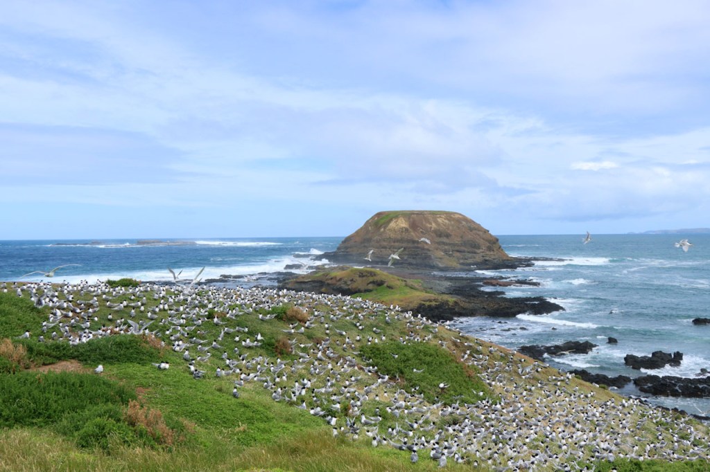 Het zag er niet mooi uit vanmorgen, donkere hemel met een duidelijke tendens naar nattigheid. Toch vertrok ik op mijn rondje Phillip Island, in de stille hoop dat het wel zou beteren. Dat deed het ook, precies bij mijn eerste stop 🙂 . Er passeerde later nog wel eens een regenzone maar die wist ik net te ontwijken. Phillip Island viel niet tegen maar wat wildlife betreft konden ze de, door henzelf zo hoog gespannen, verwachtingen toch niet inlossen. Ik zag wel weer nogal wat kangoeroes, dat was ondertussen al een tijdje geleden 😉 , maar de beste kans daartoe had je eigenlijk in het “Phillip Island Wildlife Park”, een veredelde zoo dus waar je voor wat extra de dieren ook nog kan voederen. Koala’s zie je het best in het “Koala Conservation Park”, een aparte veredelde zoo. De grootste attractie op Phillip Island zijn de pinguïns, elke avond bij zonsondergang komen ze met een paar duizend terug uit zee op het land. De Australiërs noemen dit de “Pinguin Parade” en hebben daar tribunes voor gebouwd, standaard en premium. Nu vind ik die tribunes er al behoorlijk over maar de prijzen die men er dan voor vraagt zijn er pas echt over. Ik zou echter toch niet kunnen gaan kijken, als ik al zou willen, het stadion was al uitverkocht voor vanavond. De toeristische dienst is er hier trots op dat de pinguïns het afgelopen jaar meer tickets verkochten dan Taylor Swift voor haar 7 Australische optredens, “de kleine pinguïns zijn populairder dan de grote Swift”. Wel massaal aanwezig zijn de “Cape Barren ganzen”. Ik dacht aanvankelijk dat ze exclusief voor Phillip Island moesten zijn, omdat ik ze nog nergens anders tegengekomen was. Een kenner die ik tegenkwam wist me echter te vertellen dat ze op nog wel wat plaatsen in Zuid Australië, het zuiden van Australië dus en niet noodzakelijk de staat Zuid Australië 🙂 , voorkomen maar nergens zo massaal als hier. Hier zijn ze werkelijk overal. De winnaars van vandaag zijn voor mij echter de sternen. Ik houd wel van sternen maar kreeg ze nog nooit eerder zo massaal en zo goed in beeld. Mijn rondje Phillip Island bleek uiteindelijk een behoorlijk stevige ronde te zijn 🙂 . Het ietwat “teleurstellend” Phillip Island leverde toch weer een karrenvracht aan foto’s op 🙂 .