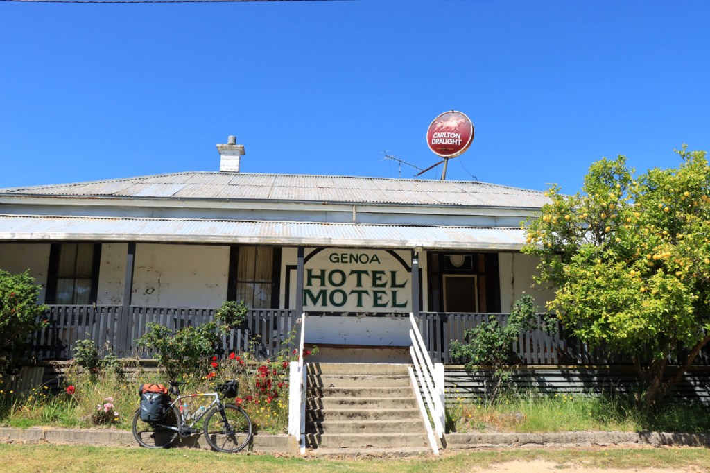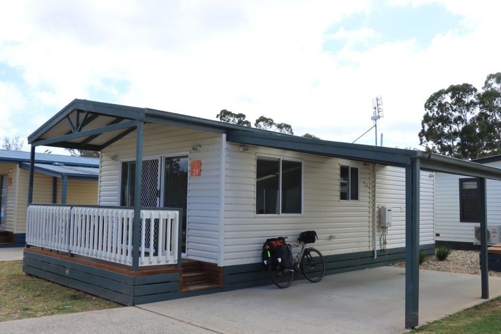 Vandaag weer een stralende dag. Ik kreeg deze keer wel al snel met een stevige tot erg stevige tegenwind te maken. De rit ging verder op hetzelfde stramien als gisteren, door het bos met veel op en af. In Genoa had ik eigenlijk op een koffie gerekend maar die kreeg ik niet. Ik had er wel een benzinestation verwacht maar dat was er niet en het Genoa Hotel Motel had duidelijk al een paar jaar geen klanten meer bediend. Zulke plaatsen kom je hier wel meer tegen, ze worden meestal nog wel aangekondigd maar hebben waarschijnlijk dus covid niet overleefd. Pas na 95 Km kreeg ik alsnog een koffiegelegenheid. Dat was maar kort voor het einde maar ik heb de gelegenheid toch nog gegrepen 🙂 . 1.400 hoogtemeters in combinatie met een stevige tegenwind maakten van vandaag een bijzonder zware dag, eentje die thuis hoort in de categorie van Meningue – Kingston. Ik zit vanavond nog eens op kamp, dat was al een paar weken geleden. Een goed uitgeruste cabine maar een beetje kleine douchecel.
