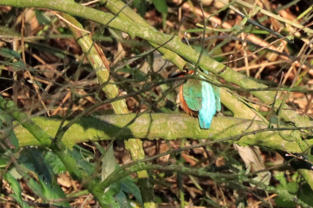 Vandaag mocht het weer een beetje verder gaan. Het was nochtans niet overal even aangenaam om te wandelen, op sommige plaatsen was het best nog verraderlijk. Er was één stuk waar ik ook vooraf al niet echt gerust op was, het smalle asfaltbaantje bergaf net na het hoogste punt. Uit ervaring weet ik dat het daar onder de huidige omstandigheden behoorlijk slecht kan liggen, met hard aangereden sneeuw en ijs. Het deed me zelfs twijfelen over het al dan niet doen van deze wandeling maar ik besloot dan om mijn “spijkerzolen”, die ik vorige winter in Noorwegen kocht, met te nemen voor dat stukje. Zo doen die ook in België nog dienst 🙂 , al is het maar voor een paar honderd meter. Ik kon vandaag eindelijk nog eens een ijsvogel in beeld brengen. Ik zie ze nog, letterlijk, wel meer passeren, op verschillende plaatsen, maar dus nooit met een fotogelegenheid. Toen ik hem vandaag binnen beeld bereik zag landen, nam ik de kans dan ook meteen te baat. Het is niet mijn beste foto maar toen ik even later wat dichterbij kwam en een betere hoek had, toen vloog hij alweer op.