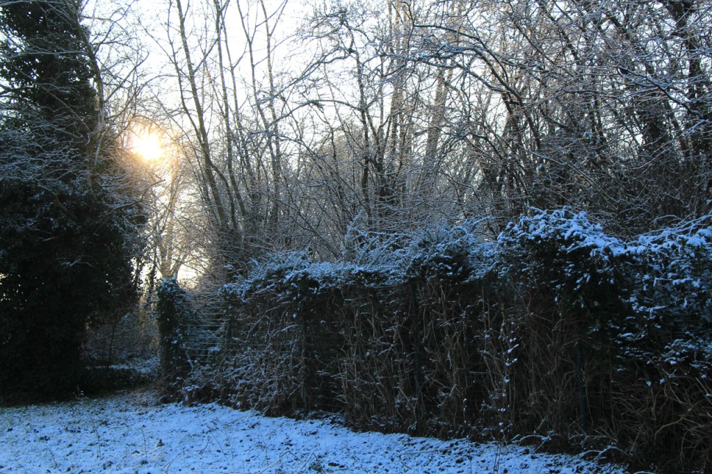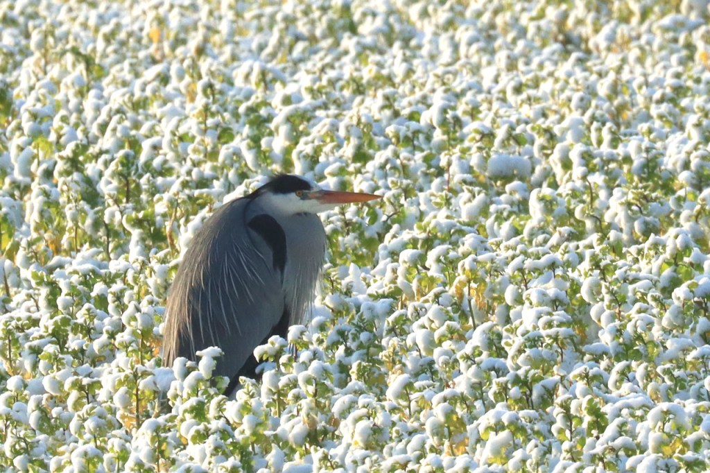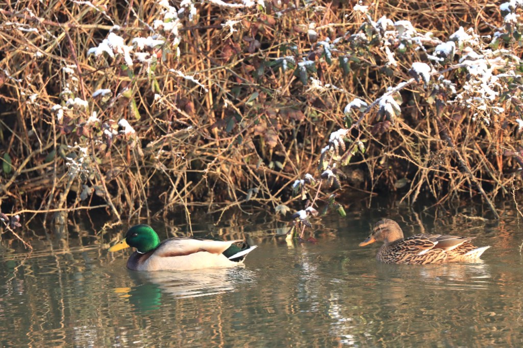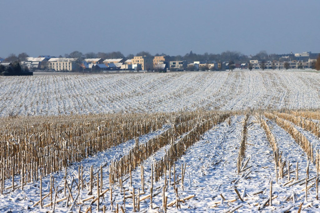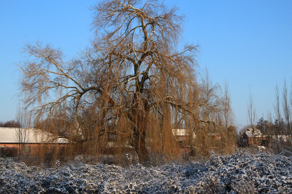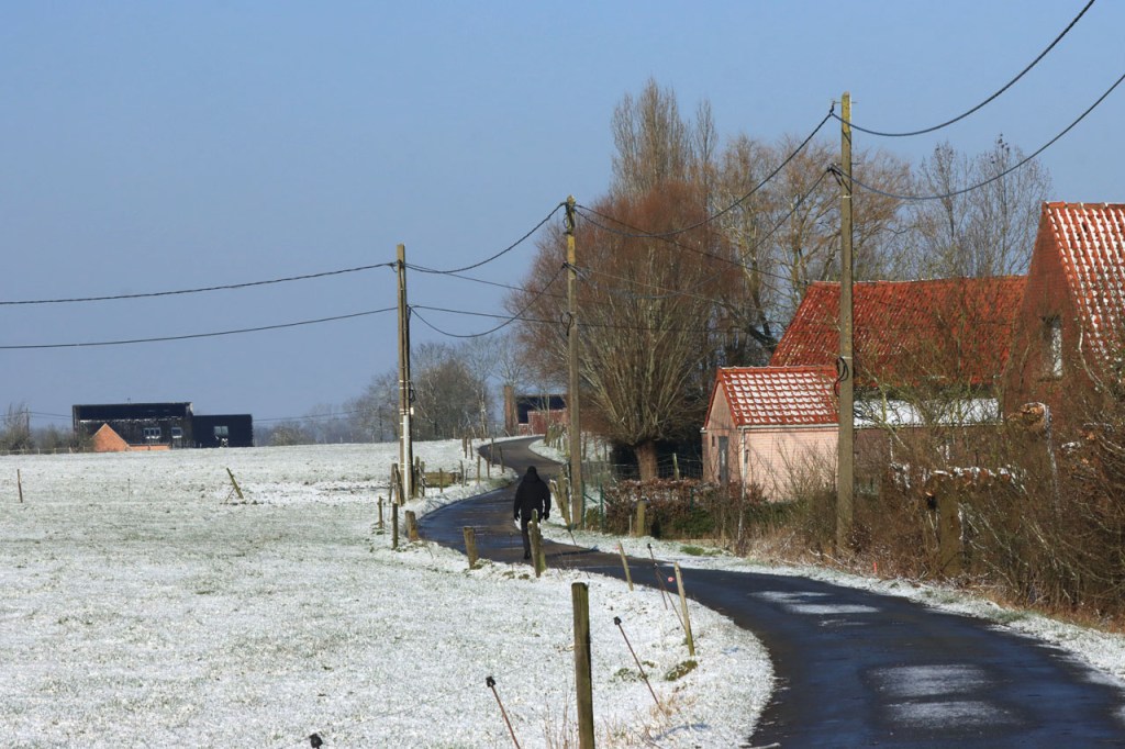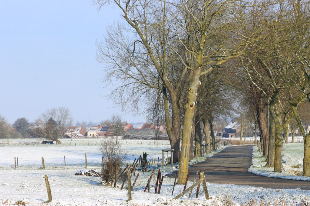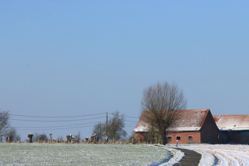 Gisteren maakte ik nog plannen om vandaag te fietsen maar uiteindelijk werd het toch weer een wandeling. Deze keer was dat omdat ik, na vrieskoude nacht met lichte sneeuwval, de wegen onvoldoende betrouwde. Ik koos dan vandaag maar meteen voor een ochtendwandeling om maximaal van de winterse sfeer te genieten. Het was duidelijk dat in de voormiddag fietsen voor mij alvast niet in aanmerking kwam, zelfs als wandelaar gaf ik dikwijls de voorkeur aan de besneeuwde graskant boven het bevroren wegdek. Ik heb er wel enkele gezien die er minder problemen mee hadden.