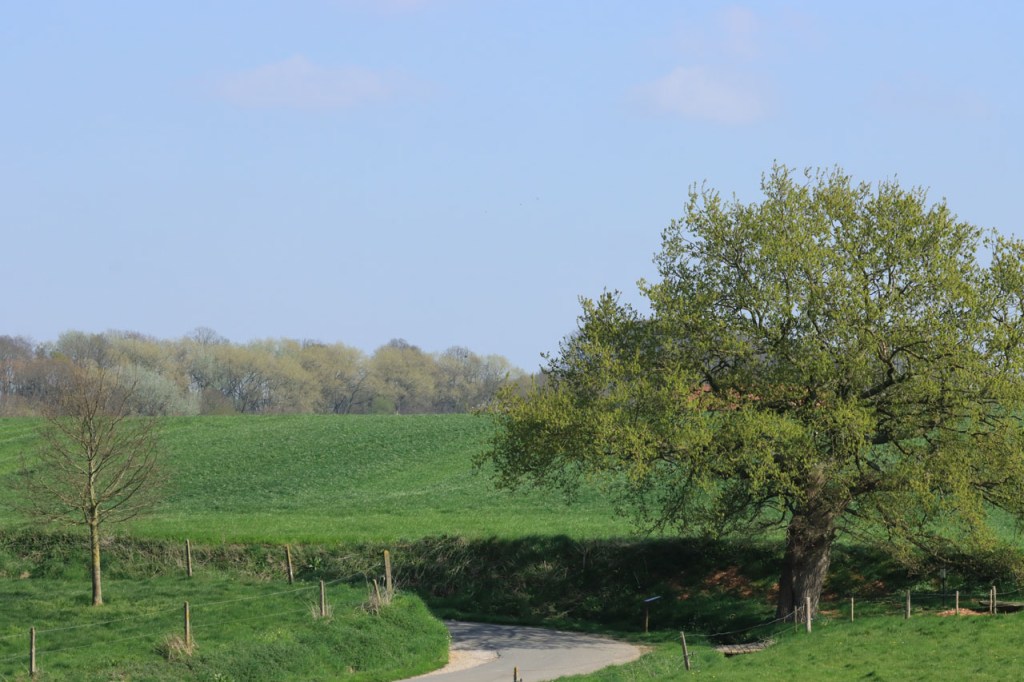 Na mijn klein tweedaags sortietje gaat het nu terug over de lokale wegen, vandaag nog eens over de golvende heuveltjes. Het was niet alleen het terrein dat golfde, met de wind tegen was het echt wel frisjes maar op de klimmetjes werd het best warm. Aan het slot zag ik nog een mooi hert maar het was er eentje van de gevangene soort.