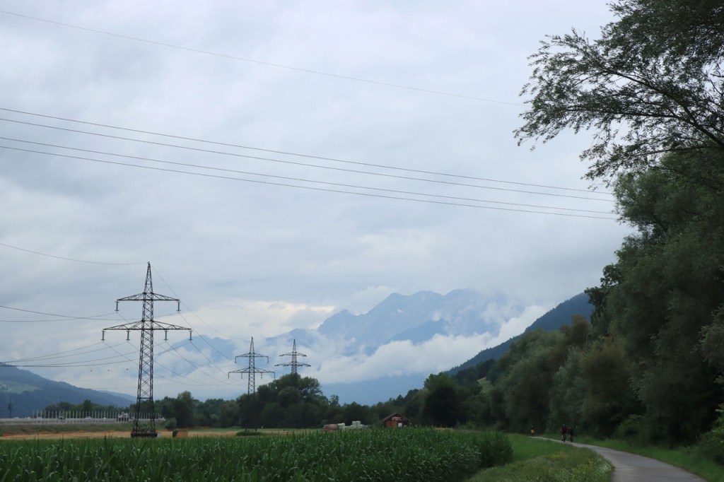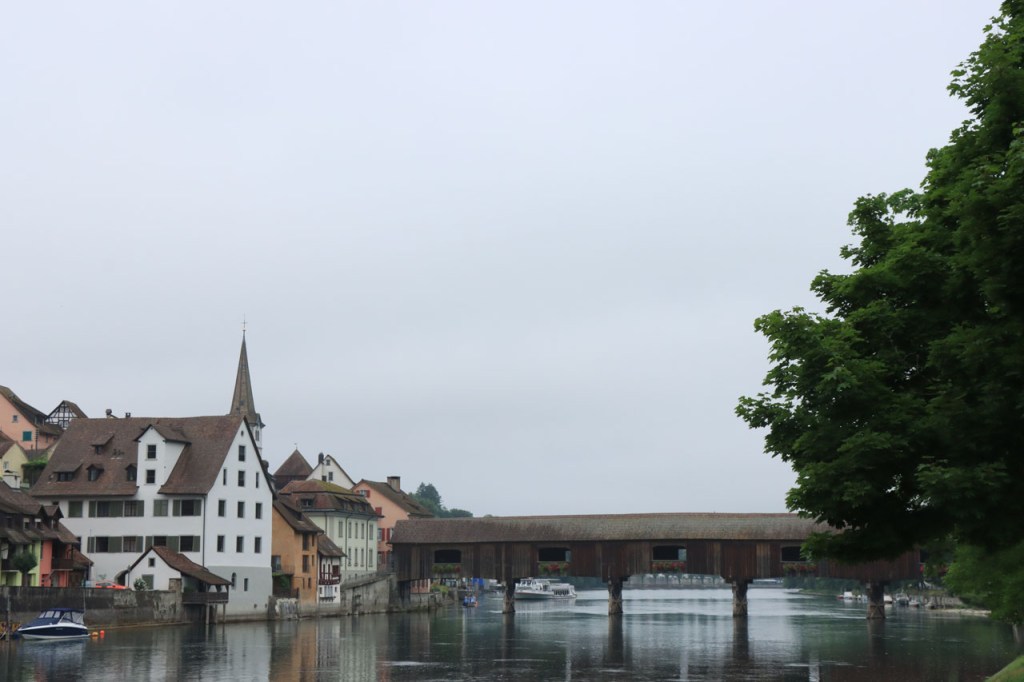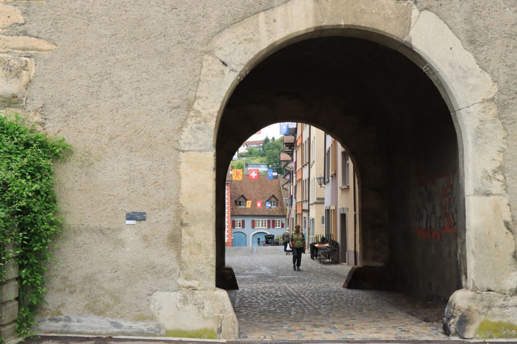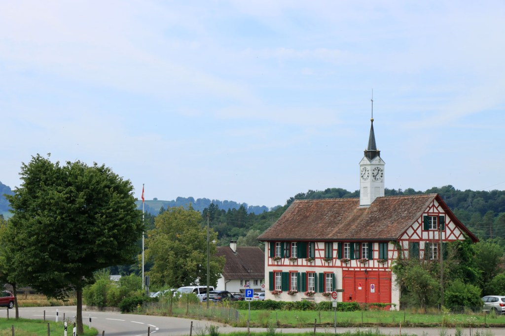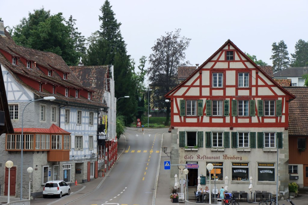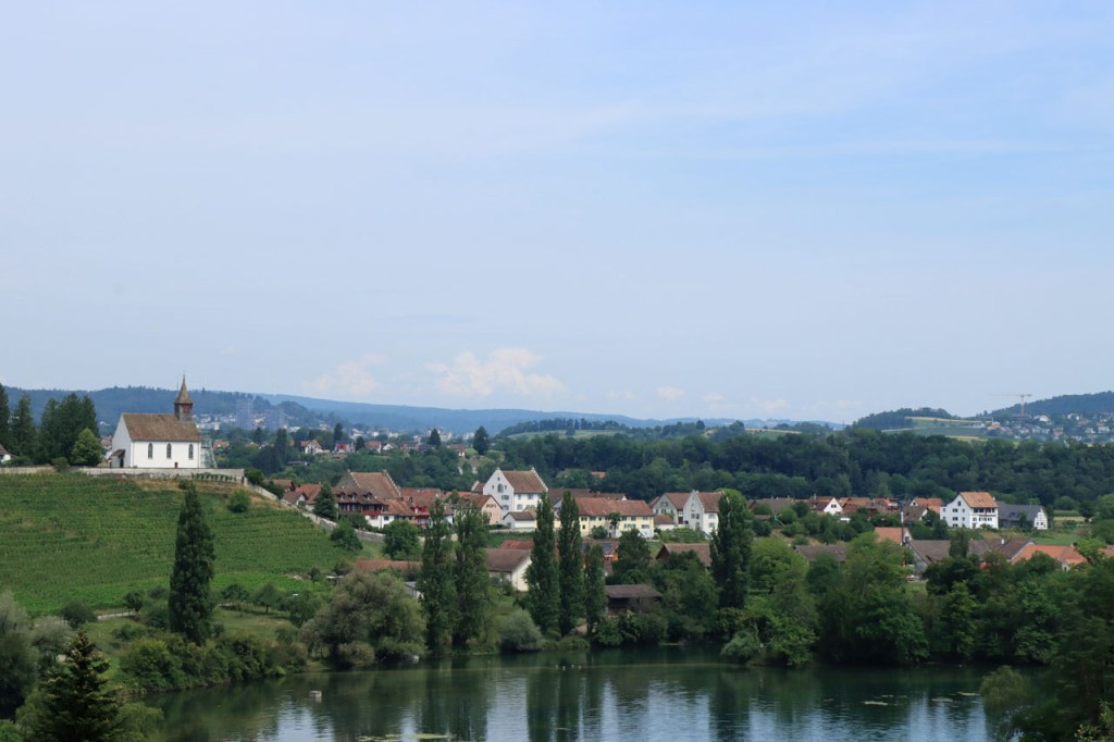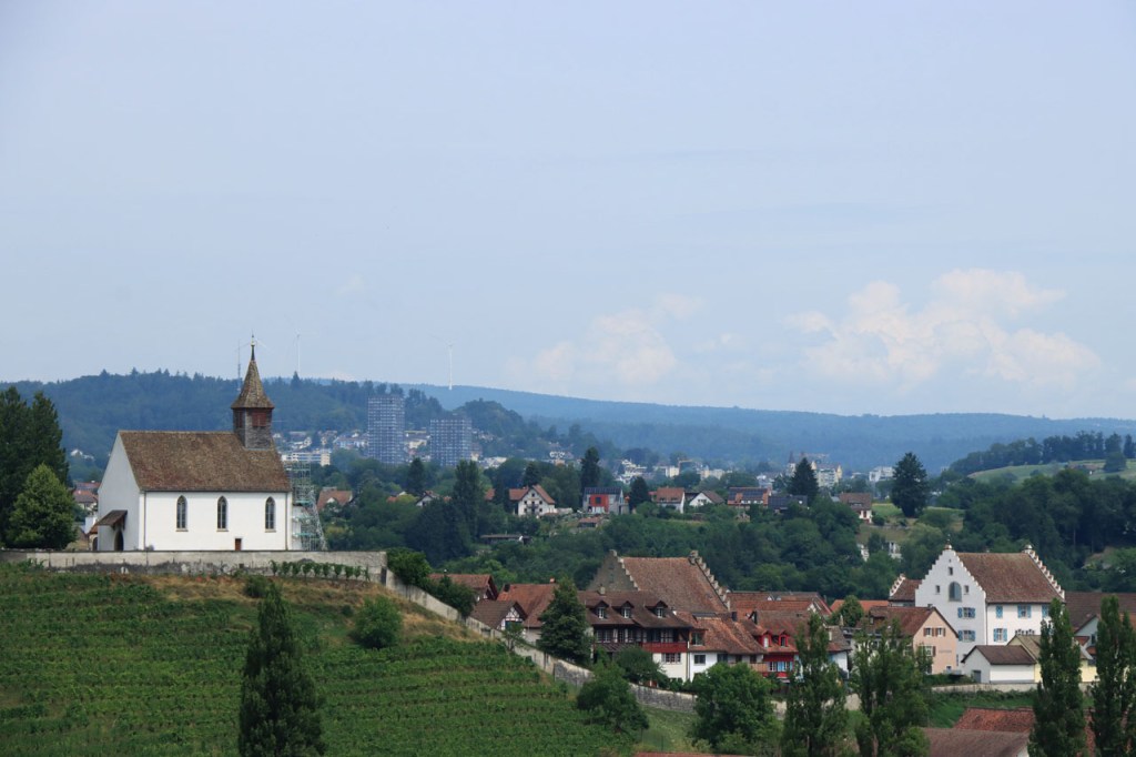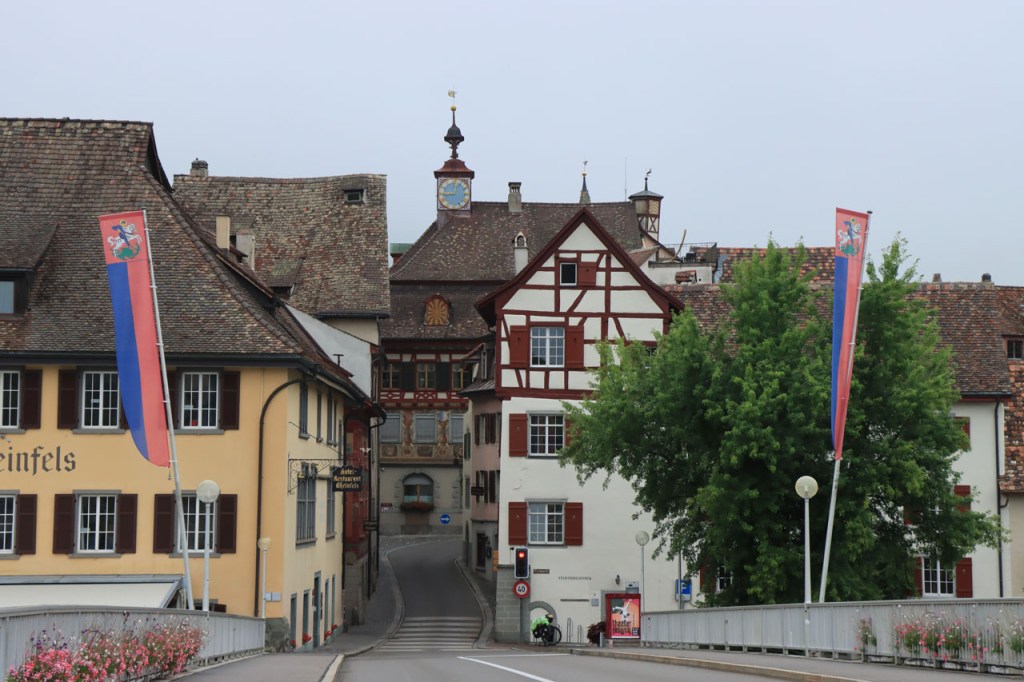 Terwijl de regen ’s avonds nog eerder in buitjes viel, ging hij vannacht stevig door. Vanmorgen stopte hij wel weer en ik kon droog inpakken, in de zin dat mijn tentje natuurlijk nog wel nat was maar dat het actueel niet meer regende. Er werd nog meer regen aangekondigd maar voor mij leek het nog wel mee te vallen, verder naar het westen zou het beter zijn. Aanvankelijk leek dat ook zo maar rond de middag kwamen er van daar toch donkere wolken opzetten. Ik besloot dan vanaf Rheinfelden de directe weg te volgen in plaats van de route, enerzijds omdat dit de kans verhoogde om voor de buien in Bazel te zijn en anderzijds omdat het de kans op een schuilplaats verhoogde wanneer het toch niet zou lukken voor de regen. Ik had geluk, net toen de eerste druppels vielen passeerde ik een groot shoppingcenter. Ik heb dan maar van de gelegenheid gebruik gemaakt om daar nog wat inkopen te doen en nog een broodje te eten om zo de bui uit te zitten. Het was echt wel een bui van het type waarin je verzuipt maar meteen ook van het type dat, in principe, niet urenlang doorgaat. Een uurtje later kon ik verder, met nog steeds dreigende wolken maar wel droog.