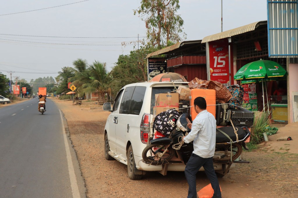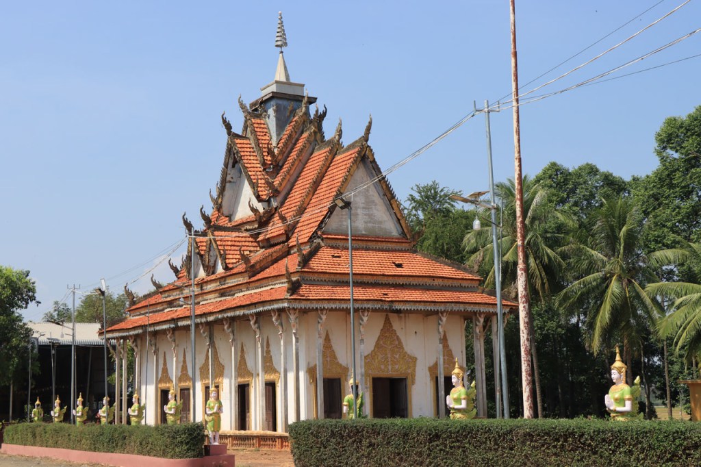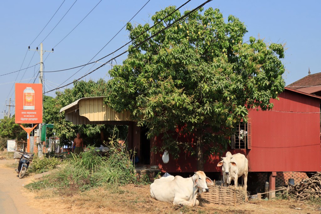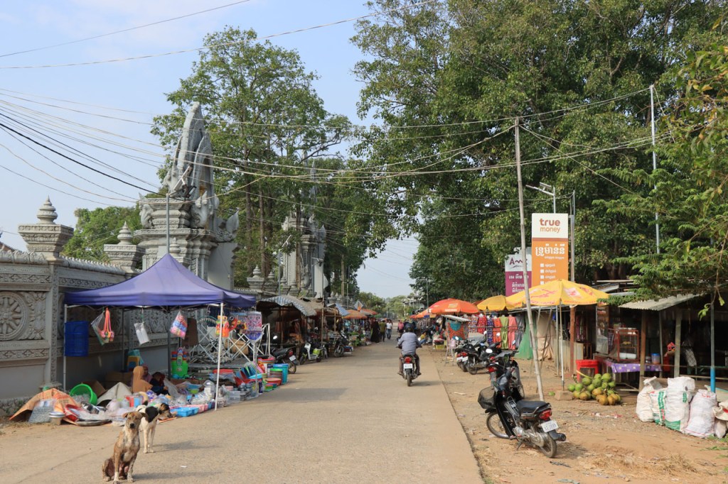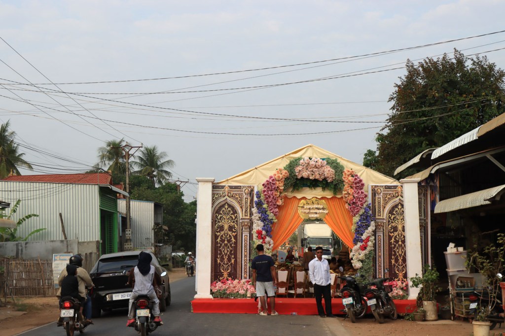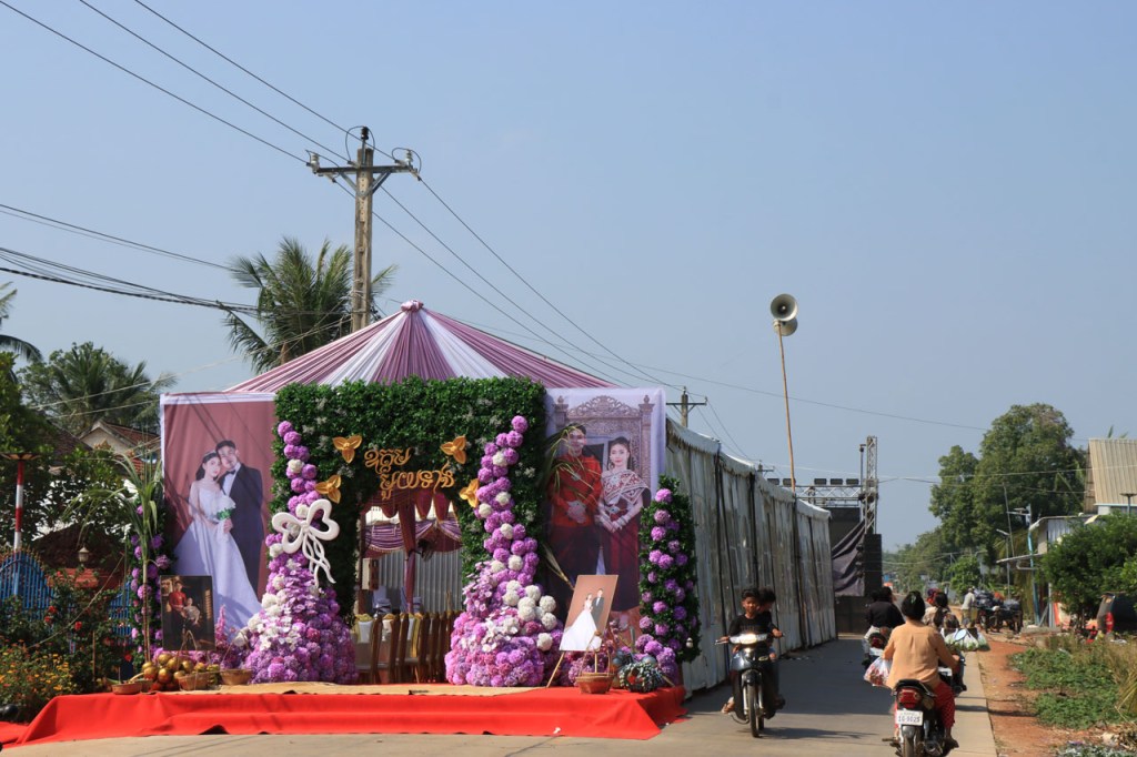 Huwelijken worden hier, in Laos en Cambodja, vrij groots gevierd. Dat kan elke dag van de week maar vandaag bleek wel héél populair 🙂 . Dat feest komt dan per vrachtwagen met stoelen, tafels, decoratie, feesttent, … en geluidsmuur. Wat dat laatste betreft, niet noodzakelijk een goede 😉 . Het is daarbij ook niet ongebruikelijk om, bij gebrek aan plaats, die feesttent gewoon op de weg te zetten. Eén keer moest ik een omleiding zoeken omdat er helemaal geen doorkomen aan was 🙂 .