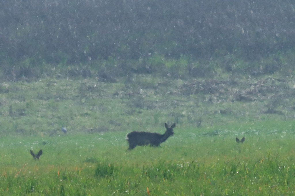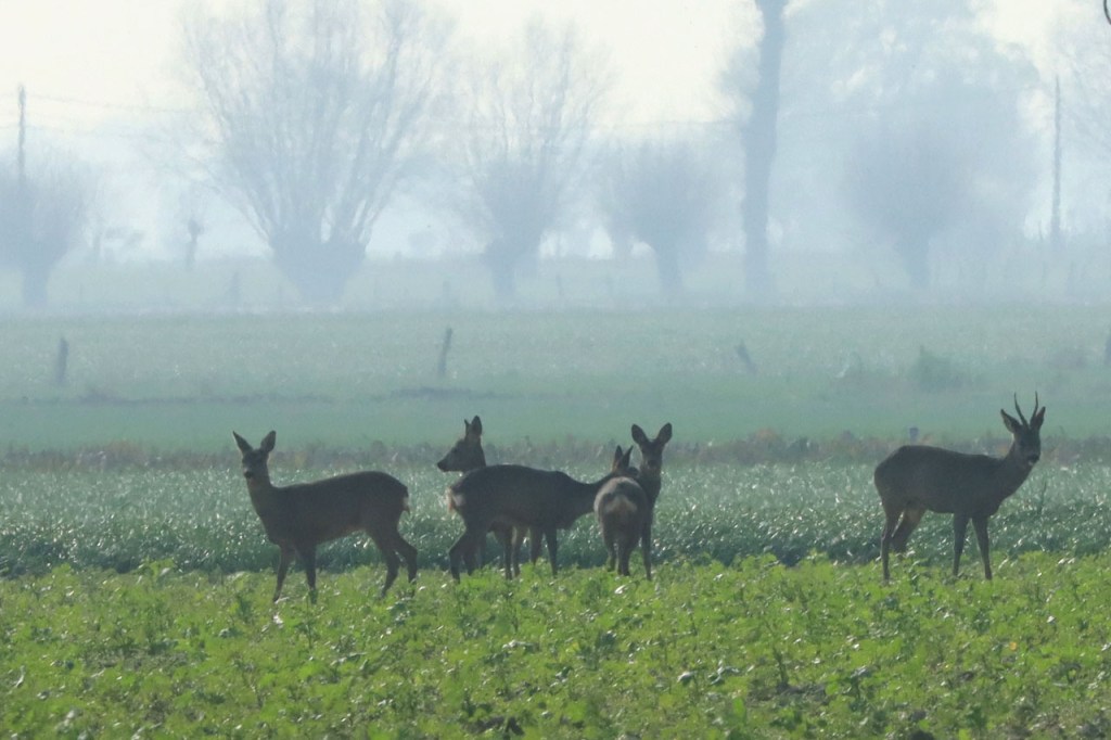 De reeën hebben blijkbaar beslist dat het de moment is om naar buiten te komen 🙂 , ik zag er ook vandaag weer. De eerste stond wel echt heel ver, zodanig ver ook dat ik de extra oortjes in het gras niet live kon zien. Het groepje dat ik later zag, stond tegen het licht. Dat gaf wel mooi een wat mistige achtergrond.