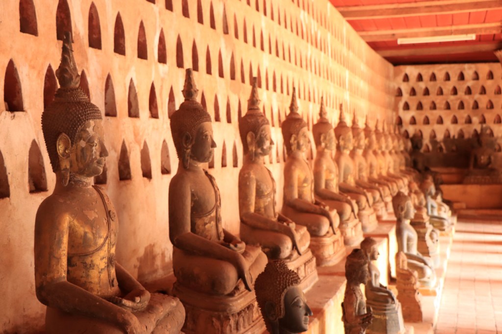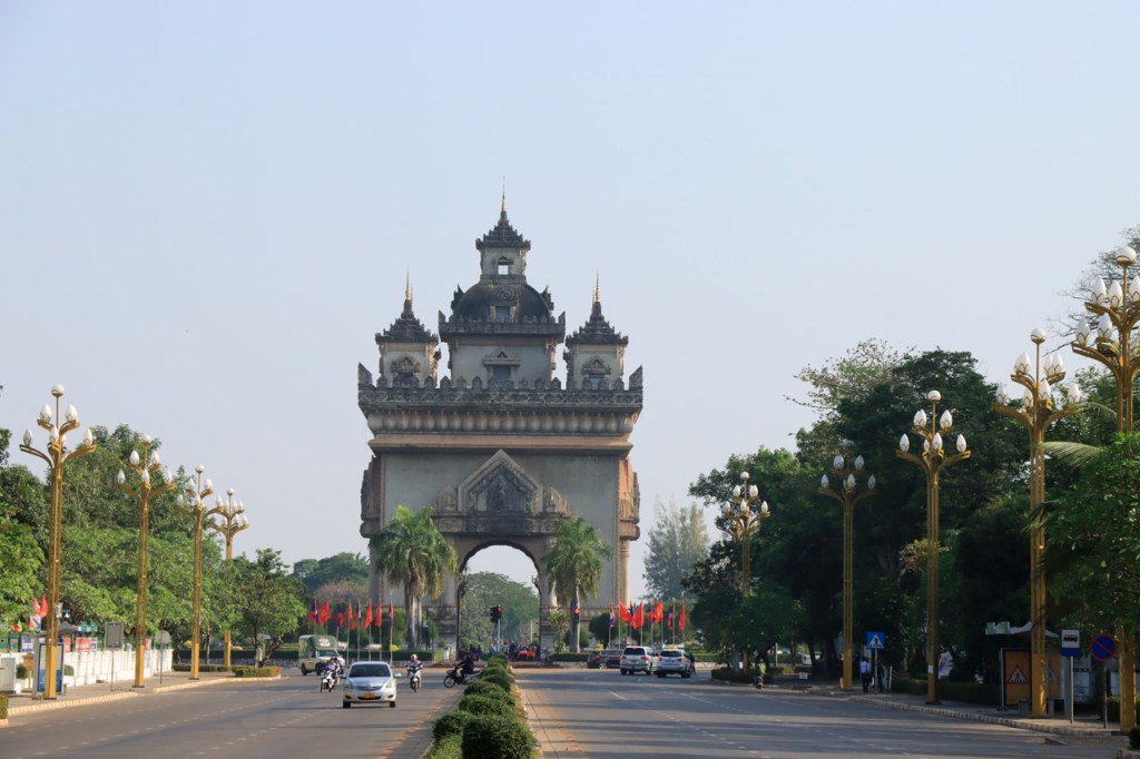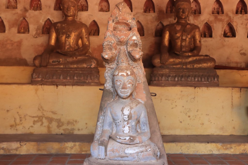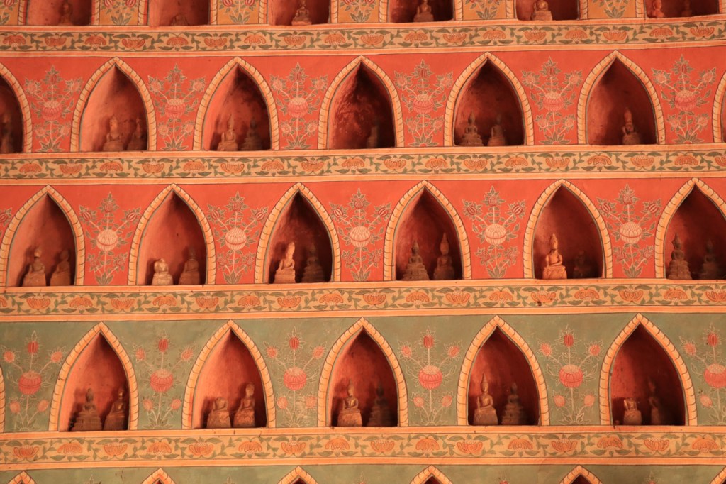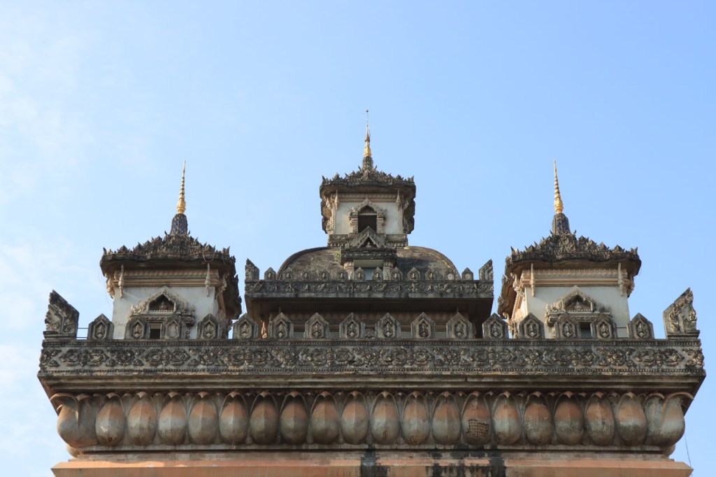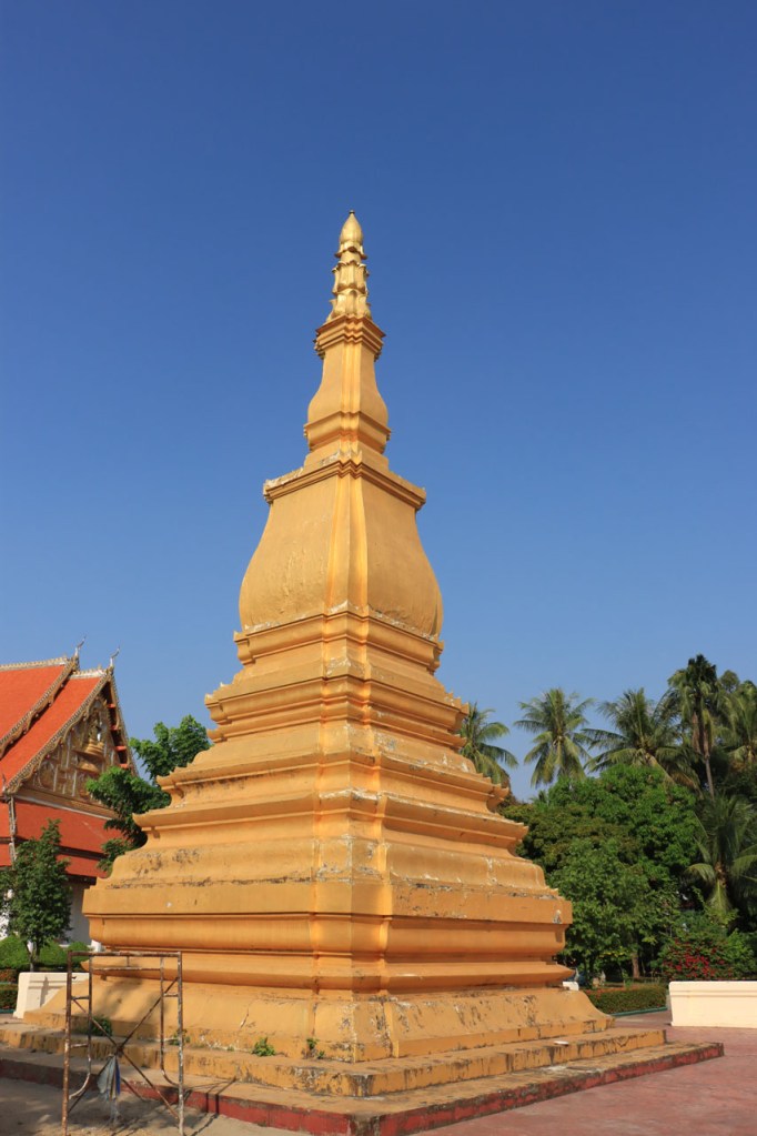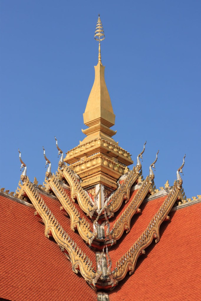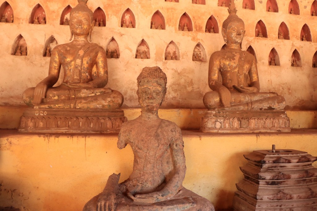 Ik zal het hier dus rustig houden maar je moet wel iets doen natuurlijk. Deze voormiddag, terwijl het nog wat koeler was, wandelde ik langs de Avenue Lanexang, met aan het ene uiteinde Patuxai en aan de andere kant Wat Si Saket. Patuxai is de Arc de Triomphe van Vientiane, een beetje ironisch gewijd aan de triomf over de Fransen die die andere grote Arc hebben die een beetje model stond voor deze. Ze maakten er wel een versie van met typische lokale architectuur. De Arc is gemaakt van beton dat de Amerikanen schonken om een luchthaven aan te leggen, de Lao bleken de voorkeur te geven aan een triomfboog. Wat Si Saket is nu een museum waar rond een oude tempel, de oudste van Vientiane, tientallen oude boeddha’s opgesteld staan en verder in nissen in de muur nog eens honderden kleine beeldjes. Ook in de muren in de tempel zijn er nog nissen met honderden kleine boeddha’s. Jammer genoeg mag je in de tempel niet fotograferen, vooral de resten van de oude muurtekeningen zijn interessant. Om een tempel te betreden moet je altijd je schoenen uitdoen, de organisatie kan niet verantwoordelijk gesteld worden voor eventuele schade 🙂 . Tussen de twee uiteinden passeerde ik ook nog langs Wat That Phoun, een moderner tempelcomplex.
