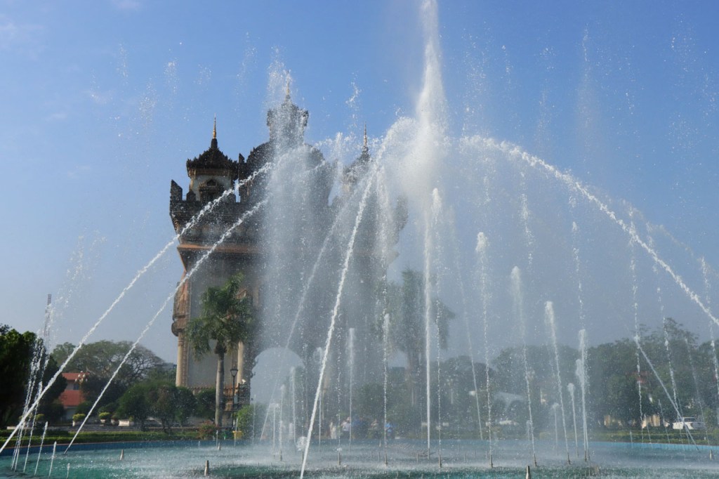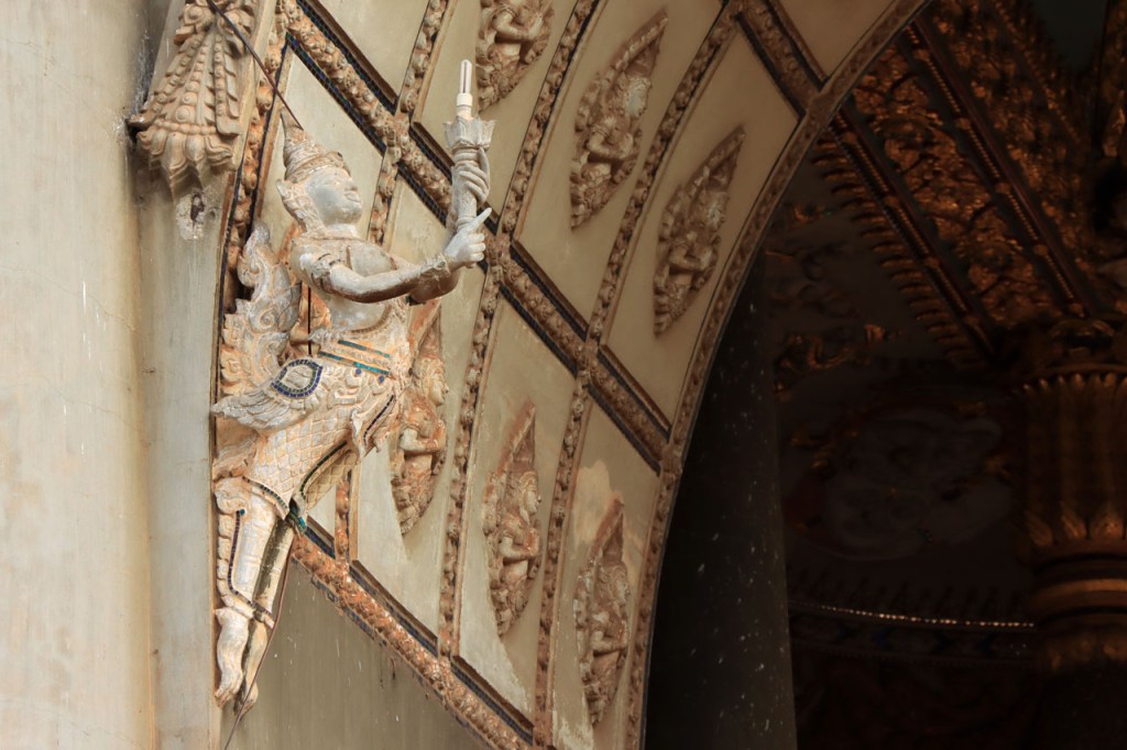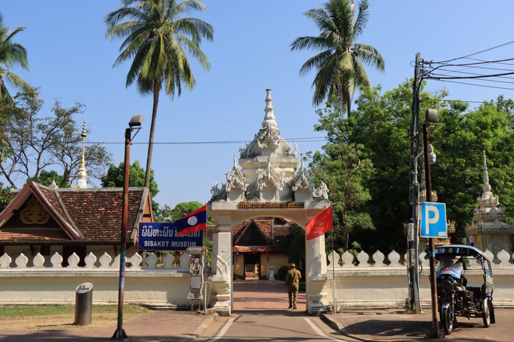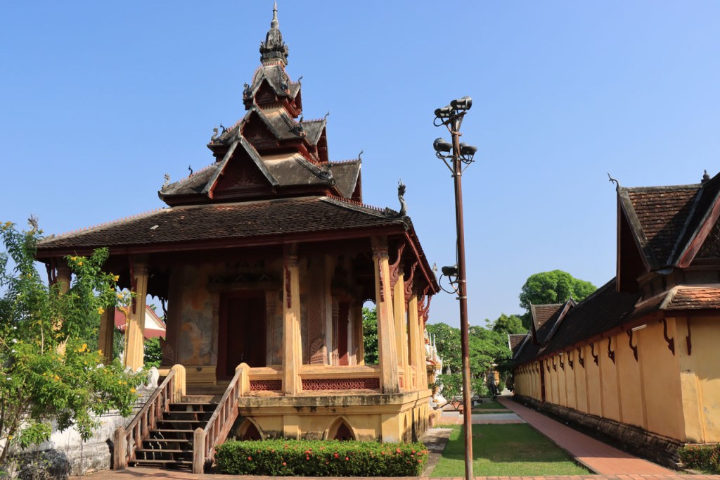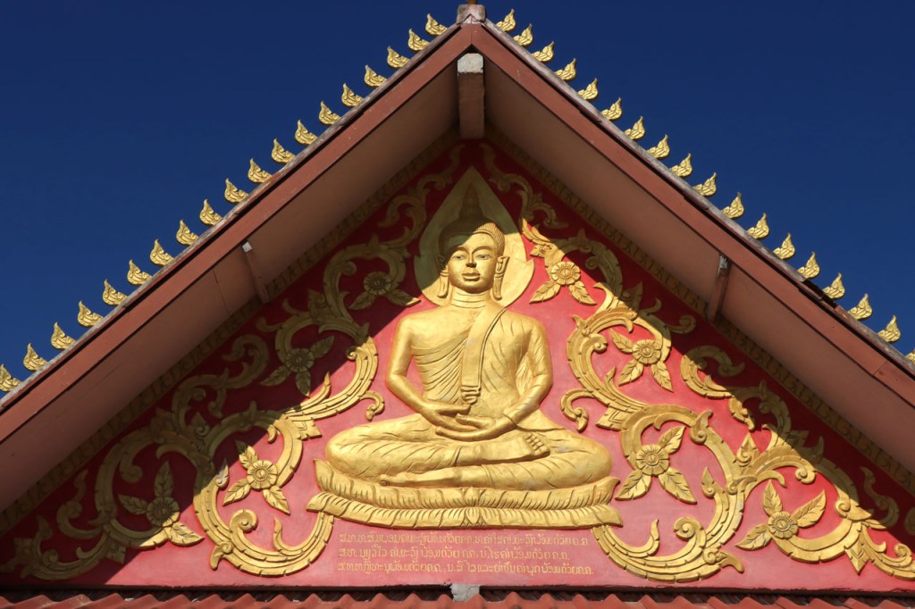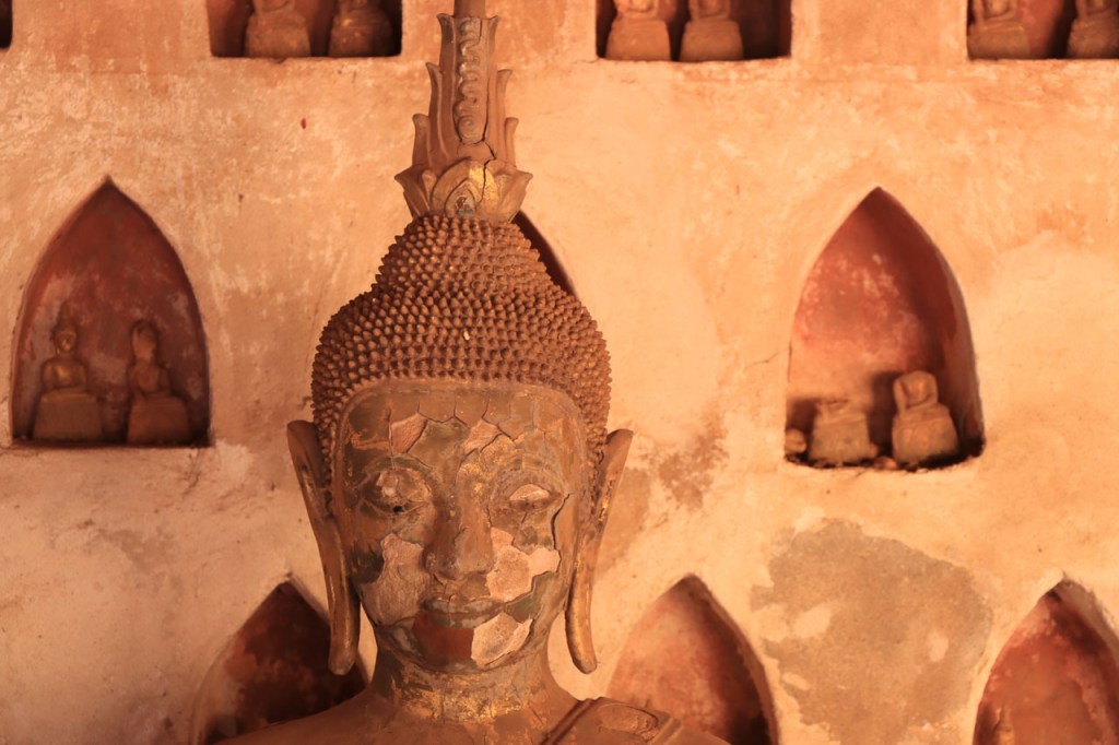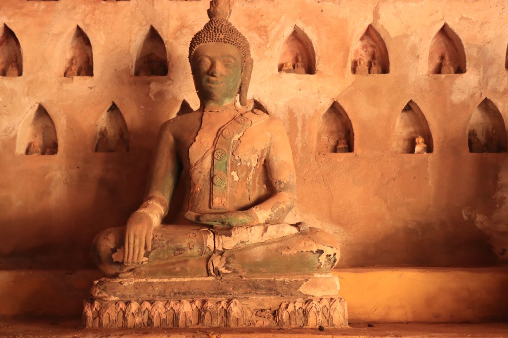 Ik zal het hier dus rustig houden maar je moet wel iets doen natuurlijk. Deze voormiddag, terwijl het nog wat koeler was, wandelde ik langs de Avenue Lanexang, met aan het ene uiteinde Patuxai en aan de andere kant Wat Si Saket. Patuxai is de Arc de Triomphe van Vientiane, een beetje ironisch gewijd aan de triomf over de Fransen die die andere grote Arc hebben die een beetje model stond voor deze. Ze maakten er wel een versie van met typische lokale architectuur. De Arc is gemaakt van beton dat de Amerikanen schonken om een luchthaven aan te leggen, de Lao bleken de voorkeur te geven aan een triomfboog. Wat Si Saket is nu een museum waar rond een oude tempel, de oudste van Vientiane, tientallen oude boeddha’s opgesteld staan en verder in nissen in de muur nog eens honderden kleine beeldjes. Ook in de muren in de tempel zijn er nog nissen met honderden kleine boeddha’s. Jammer genoeg mag je in de tempel niet fotograferen, vooral de resten van de oude muurtekeningen zijn interessant. Om een tempel te betreden moet je altijd je schoenen uitdoen, de organisatie kan niet verantwoordelijk gesteld worden voor eventuele schade 🙂 . Tussen de twee uiteinden passeerde ik ook nog langs Wat That Phoun, een moderner tempelcomplex.