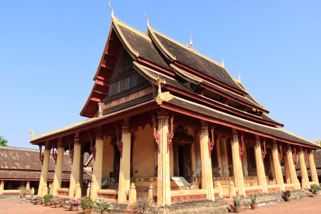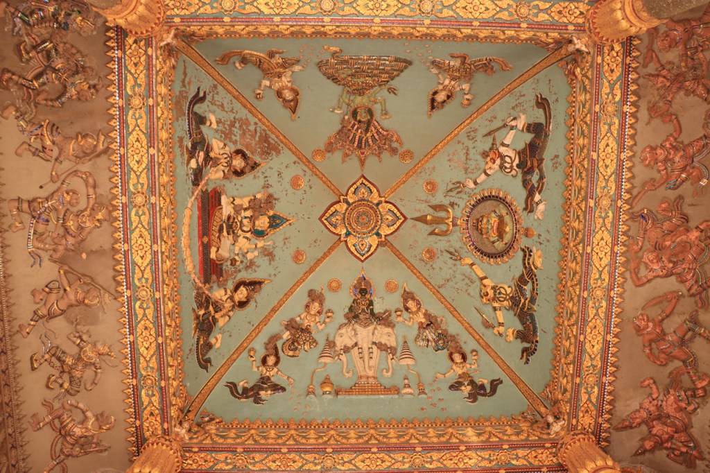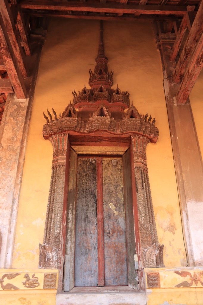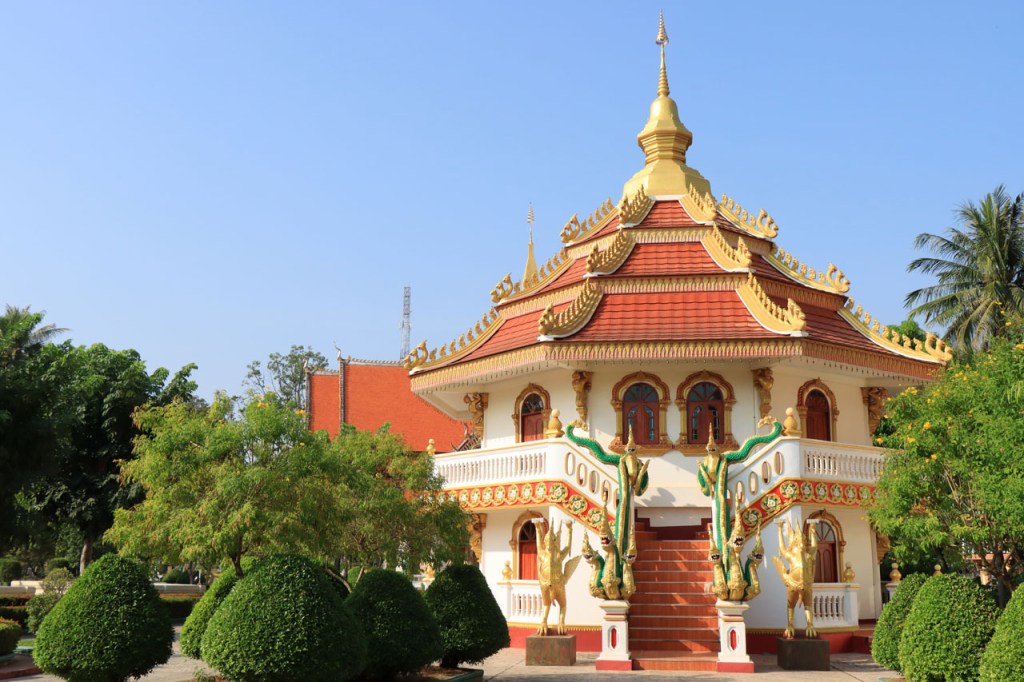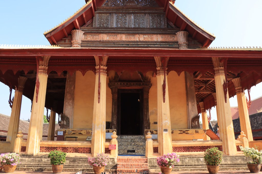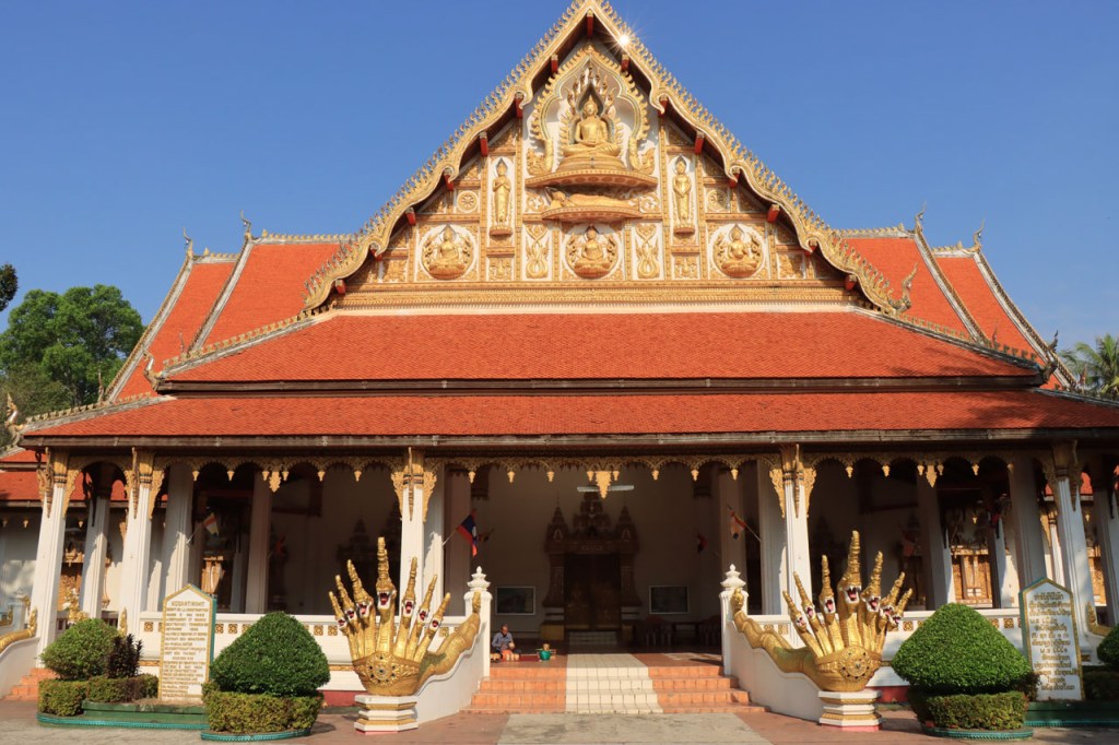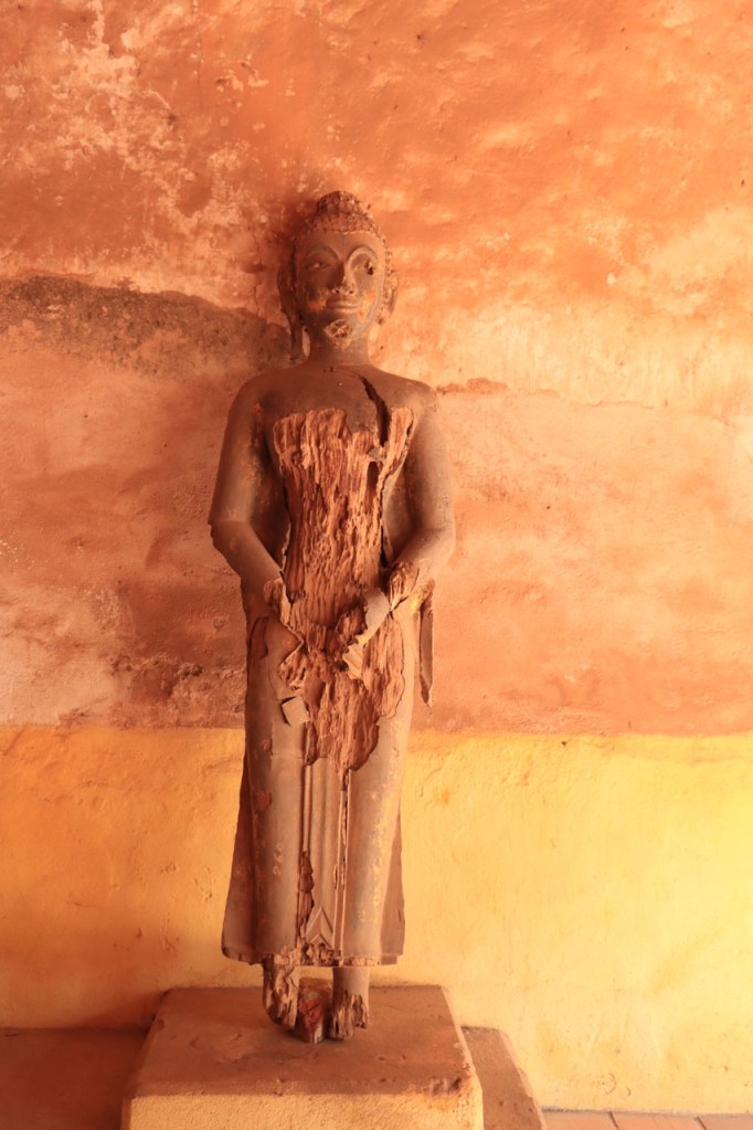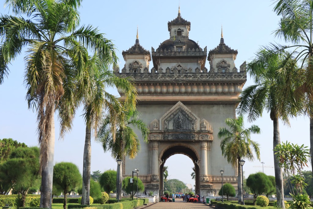 Ik zal het hier dus rustig houden maar je moet wel iets doen natuurlijk. Deze voormiddag, terwijl het nog wat koeler was, wandelde ik langs de Avenue Lanexang, met aan het ene uiteinde Patuxai en aan de andere kant Wat Si Saket. Patuxai is de Arc de Triomphe van Vientiane, een beetje ironisch gewijd aan de triomf over de Fransen die die andere grote Arc hebben die een beetje model stond voor deze. Ze maakten er wel een versie van met typische lokale architectuur. De Arc is gemaakt van beton dat de Amerikanen schonken om een luchthaven aan te leggen, de Lao bleken de voorkeur te geven aan een triomfboog. Wat Si Saket is nu een museum waar rond een oude tempel, de oudste van Vientiane, tientallen oude boeddha’s opgesteld staan en verder in nissen in de muur nog eens honderden kleine beeldjes. Ook in de muren in de tempel zijn er nog nissen met honderden kleine boeddha’s. Jammer genoeg mag je in de tempel niet fotograferen, vooral de resten van de oude muurtekeningen zijn interessant. Om een tempel te betreden moet je altijd je schoenen uitdoen, de organisatie kan niet verantwoordelijk gesteld worden voor eventuele schade 🙂 . Tussen de twee uiteinden passeerde ik ook nog langs Wat That Phoun, een moderner tempelcomplex.