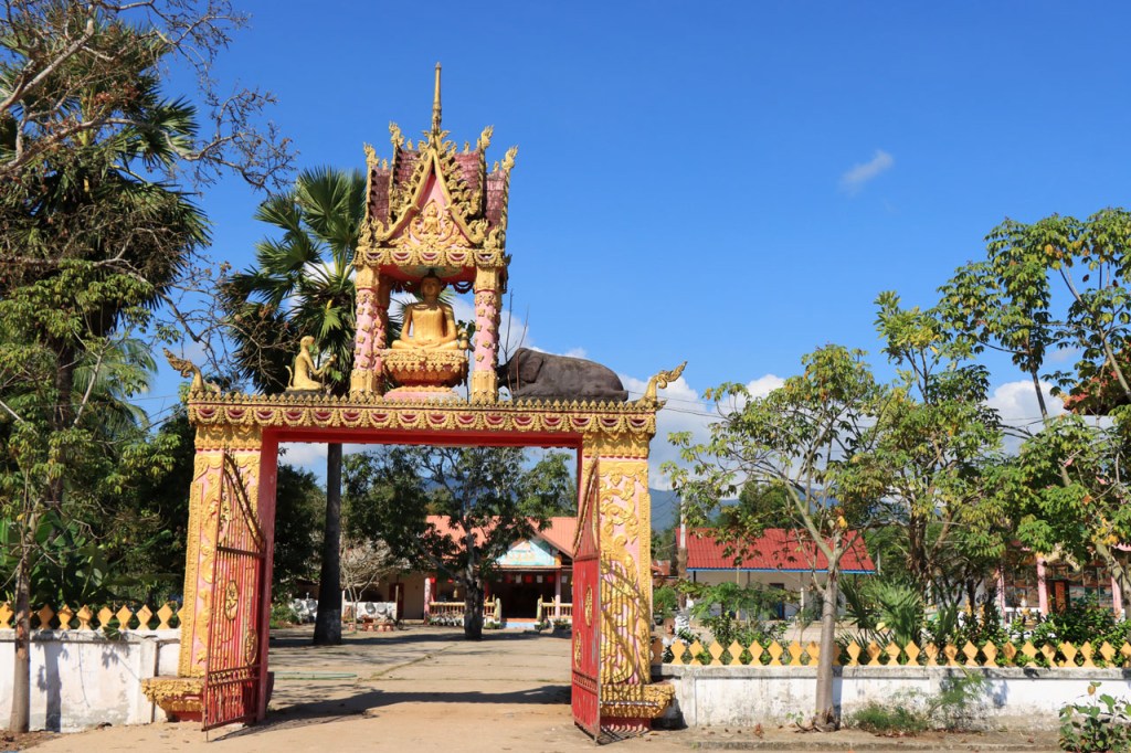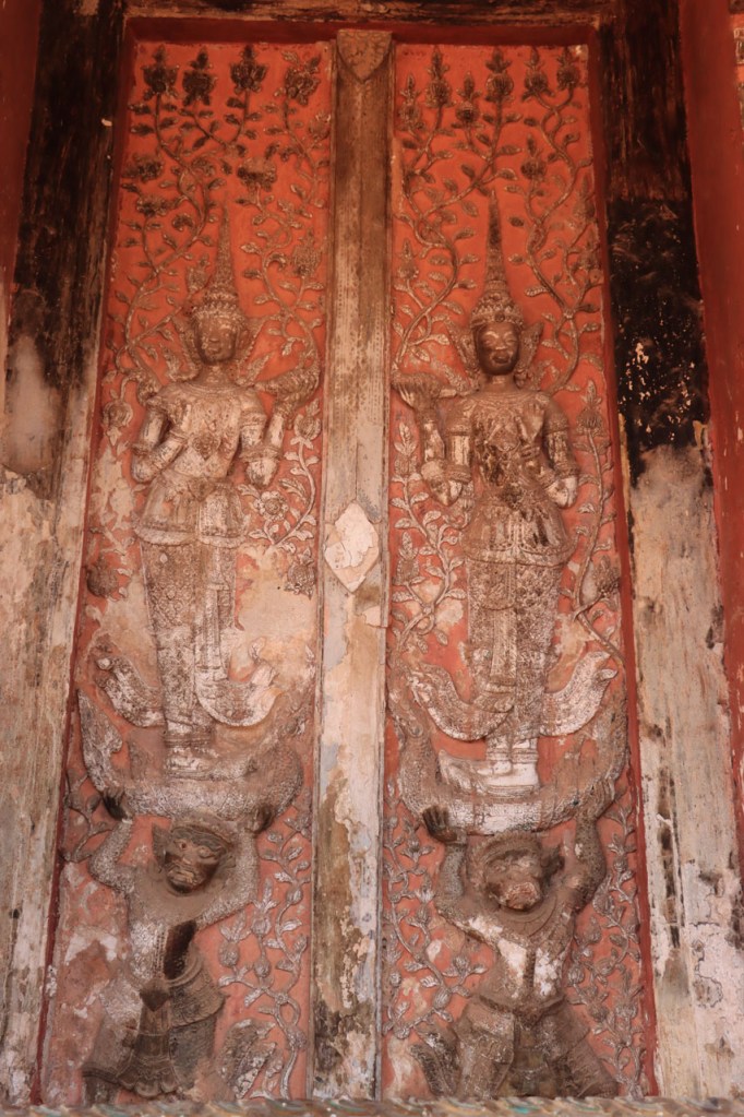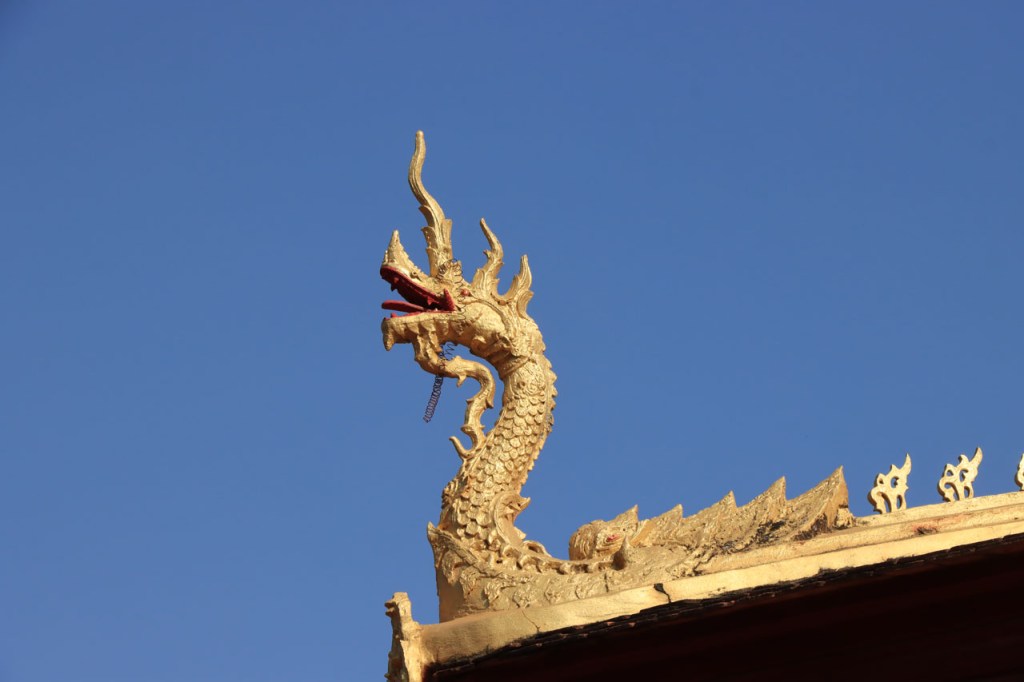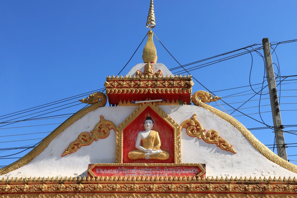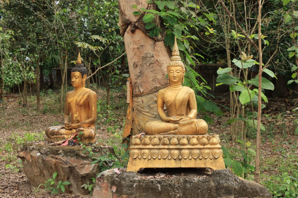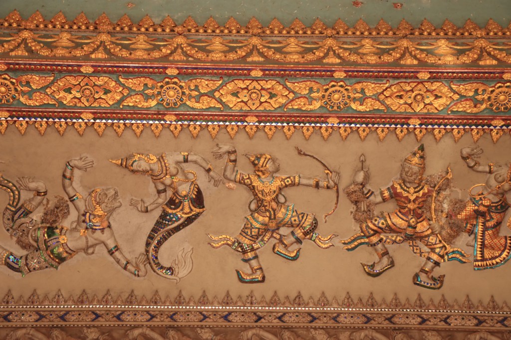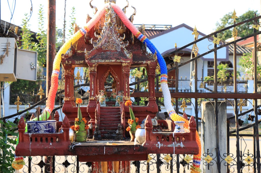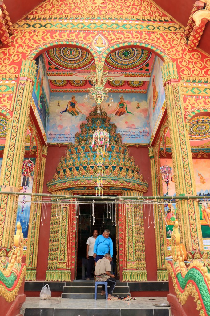 Ik zal het hier dus rustig houden maar je moet wel iets doen natuurlijk. Deze voormiddag, terwijl het nog wat koeler was, wandelde ik langs de Avenue Lanexang, met aan het ene uiteinde Patuxai en aan de andere kant Wat Si Saket. Patuxai is de Arc de Triomphe van Vientiane, een beetje ironisch gewijd aan de triomf over de Fransen die die andere grote Arc hebben die een beetje model stond voor deze. Ze maakten er wel een versie van met typische lokale architectuur. De Arc is gemaakt van beton dat de Amerikanen schonken om een luchthaven aan te leggen, de Lao bleken de voorkeur te geven aan een triomfboog. Wat Si Saket is nu een museum waar rond een oude tempel, de oudste van Vientiane, tientallen oude boeddha’s opgesteld staan en verder in nissen in de muur nog eens honderden kleine beeldjes. Ook in de muren in de tempel zijn er nog nissen met honderden kleine boeddha’s. Jammer genoeg mag je in de tempel niet fotograferen, vooral de resten van de oude muurtekeningen zijn interessant. Om een tempel te betreden moet je altijd je schoenen uitdoen, de organisatie kan niet verantwoordelijk gesteld worden voor eventuele schade 🙂 . Tussen de twee uiteinden passeerde ik ook nog langs Wat That Phoun, een moderner tempelcomplex.