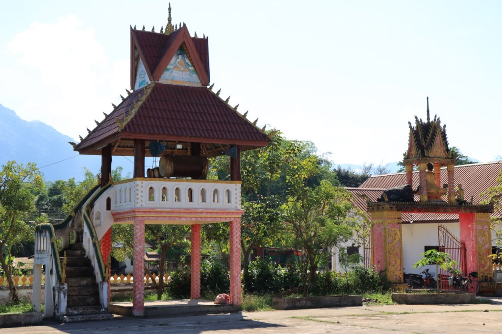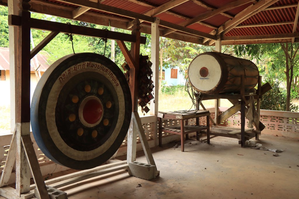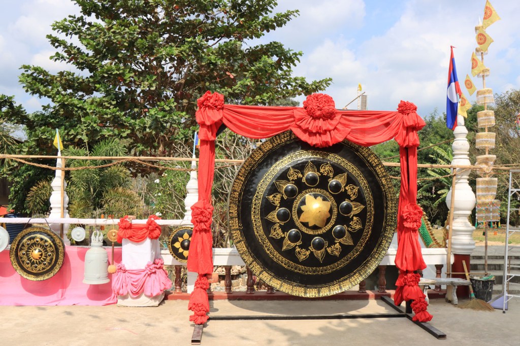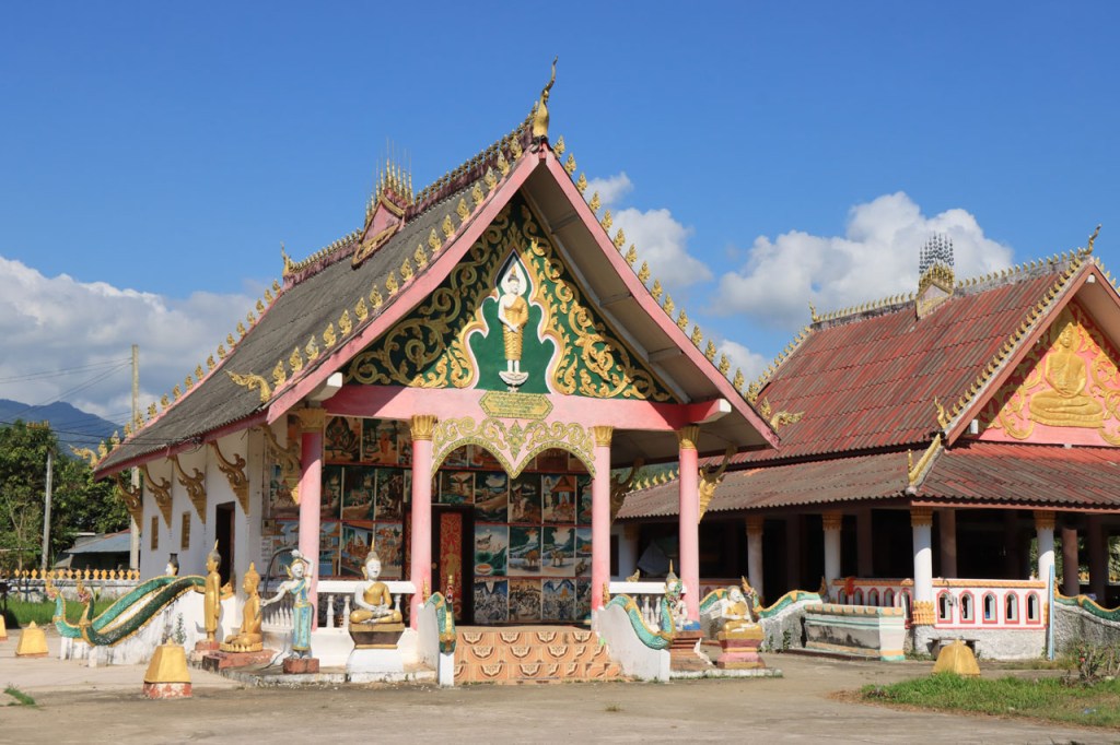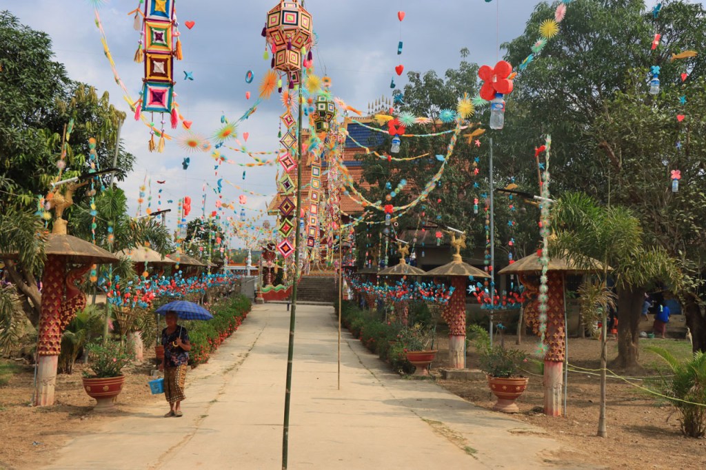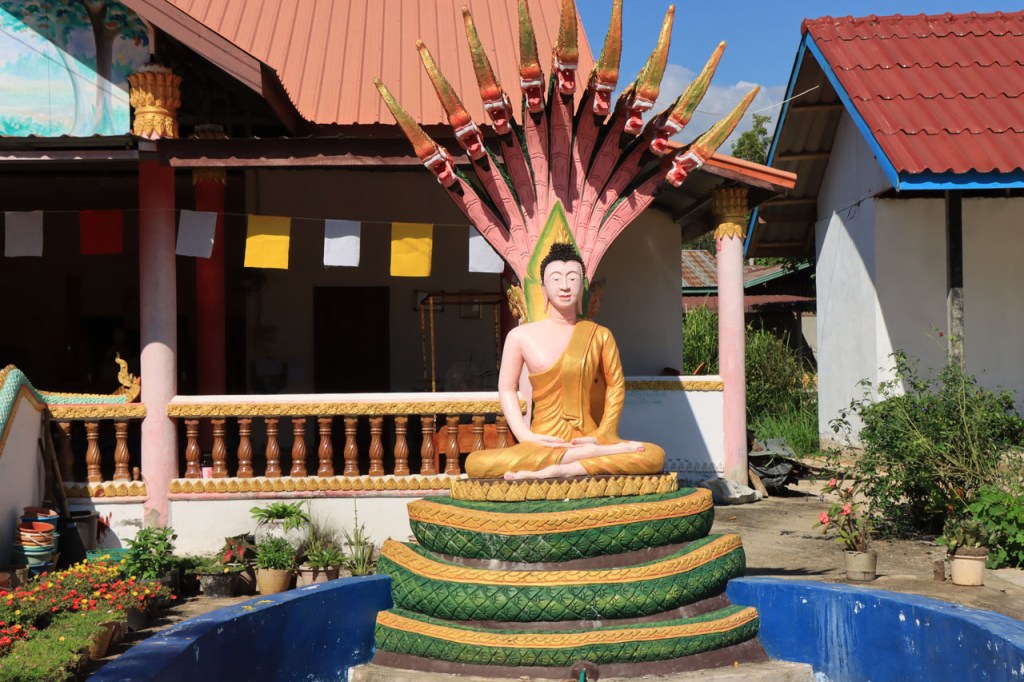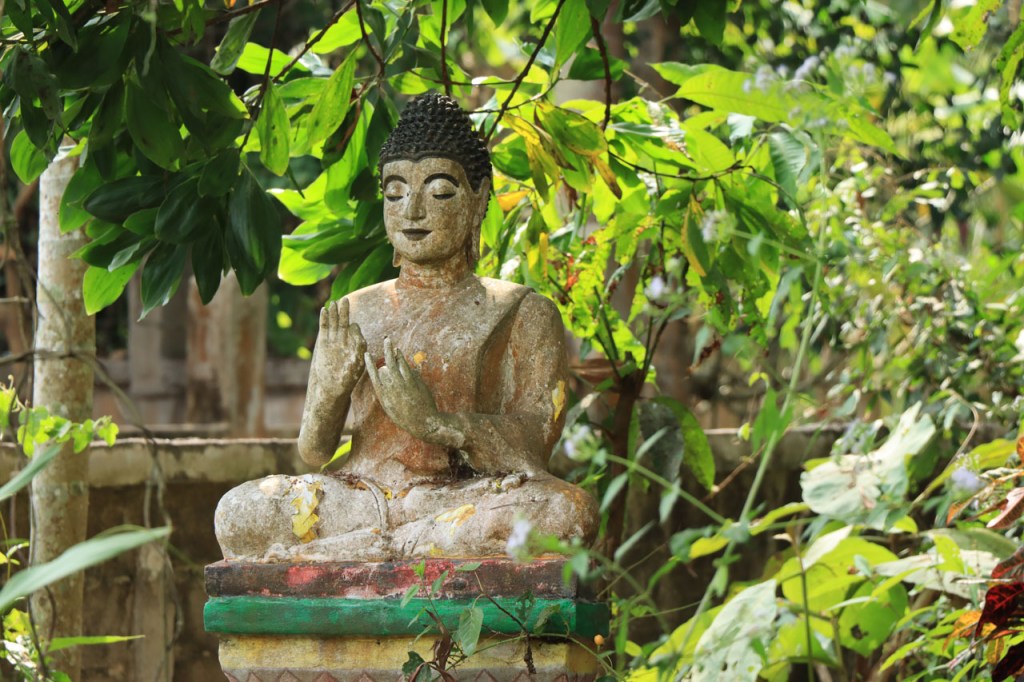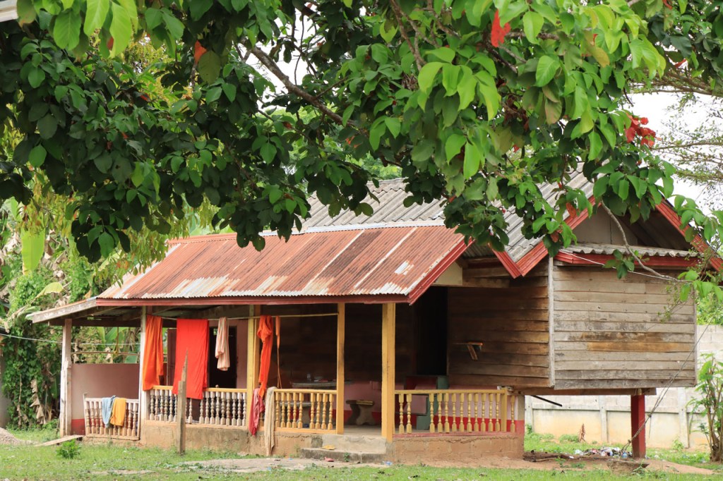 Ik zal het hier dus rustig houden maar je moet wel iets doen natuurlijk. Deze voormiddag, terwijl het nog wat koeler was, wandelde ik langs de Avenue Lanexang, met aan het ene uiteinde Patuxai en aan de andere kant Wat Si Saket. Patuxai is de Arc de Triomphe van Vientiane, een beetje ironisch gewijd aan de triomf over de Fransen die die andere grote Arc hebben die een beetje model stond voor deze. Ze maakten er wel een versie van met typische lokale architectuur. De Arc is gemaakt van beton dat de Amerikanen schonken om een luchthaven aan te leggen, de Lao bleken de voorkeur te geven aan een triomfboog. Wat Si Saket is nu een museum waar rond een oude tempel, de oudste van Vientiane, tientallen oude boeddha’s opgesteld staan en verder in nissen in de muur nog eens honderden kleine beeldjes. Ook in de muren in de tempel zijn er nog nissen met honderden kleine boeddha’s. Jammer genoeg mag je in de tempel niet fotograferen, vooral de resten van de oude muurtekeningen zijn interessant. Om een tempel te betreden moet je altijd je schoenen uitdoen, de organisatie kan niet verantwoordelijk gesteld worden voor eventuele schade 🙂 . Tussen de twee uiteinden passeerde ik ook nog langs Wat That Phoun, een moderner tempelcomplex.